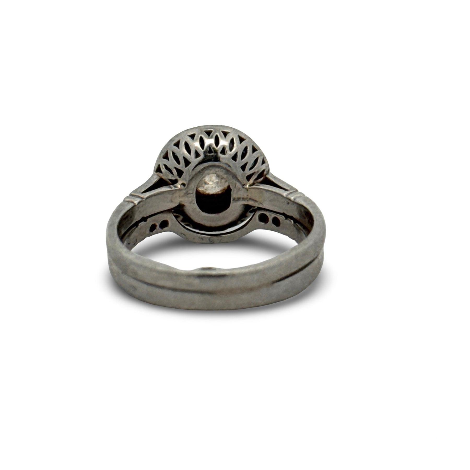 This exquisite Art Deco ring from the 1920s features a 0.55 ct Old European cut diamond of K color and VS2 clarity, set in 6.95 grams of platinum. It is accented by sixteen 0.2 ct French cut sapphires and eight 0.04 ct single cut diamonds of I color and SI2 clarity. Sized at 4.5, this estate bridal piece exemplifies the elegance and craftsmanship of the era, offering a timeless blend of vintage sophistication and enduring quality.