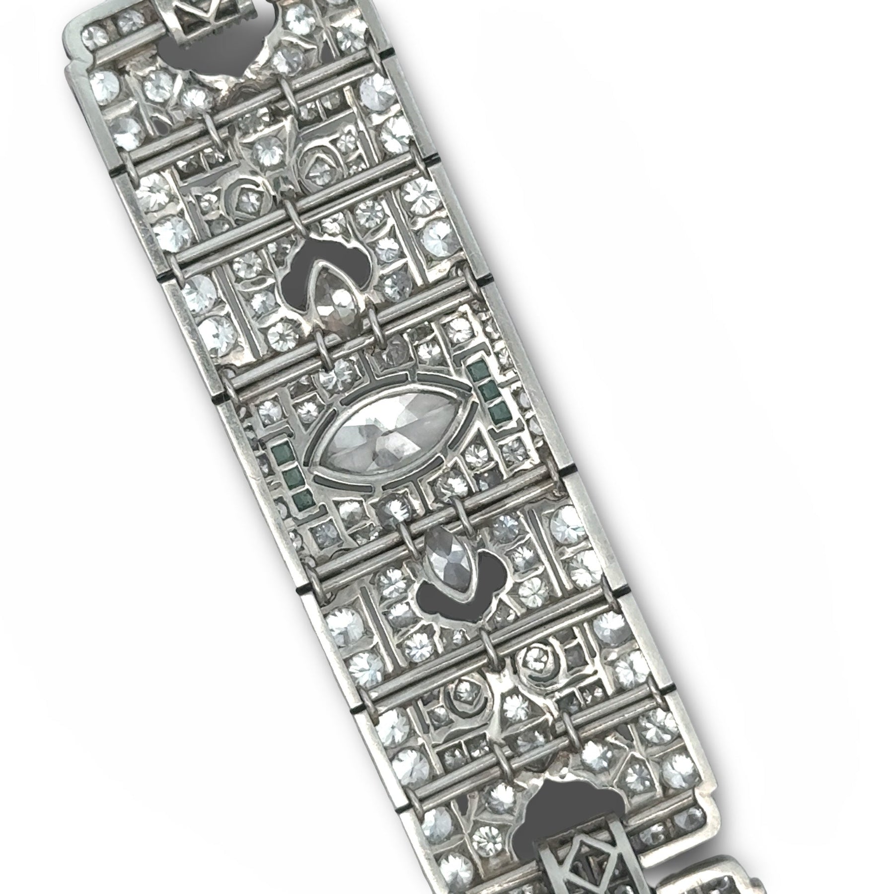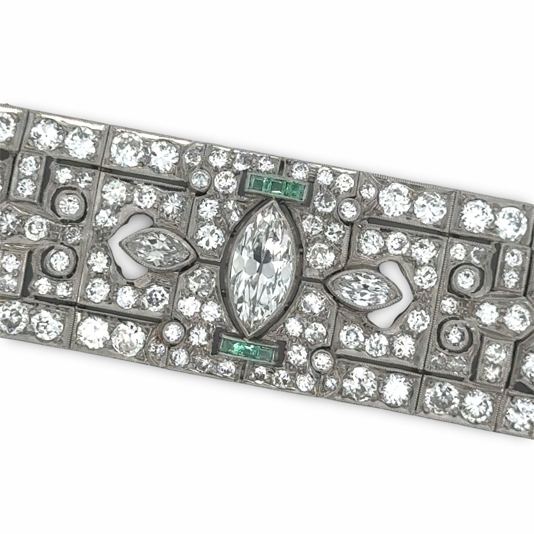 Jewelry Type : Bracelet Metal Type : Platinum Metal Weight : 58.90 grams Brand : Estate Period : Art Deco 1920's Measurement : 7.5 inches Side Stone 1 : Stone Type : Diamond Side Stone 1 : Shape : Marquise Cut Side Stone 1 : Stone Weight : 4 ct Side Stone 1 : Quantity : 3 Side Stone 1 : Color : H-I Side Stone 1 : Clarity : VVS1-VS2 Side Stone 2 : Stone Type : Diamond Side Stone 2 : Shape : Old European Cut Side Stone 2 : Stone Weight : 19 ct Side Stone 2 : Quantity : 384 Side Stone 2 : Color : H-I Side Stone 2 : Clarity : VS1-SI1 Side Stone 3 : Stone Type : Emerald Side Stone 3 : Shape : French Cut Side Stone 3 : Stone Weight : 0.5 ct Side Stone 3 : Quantity : 18