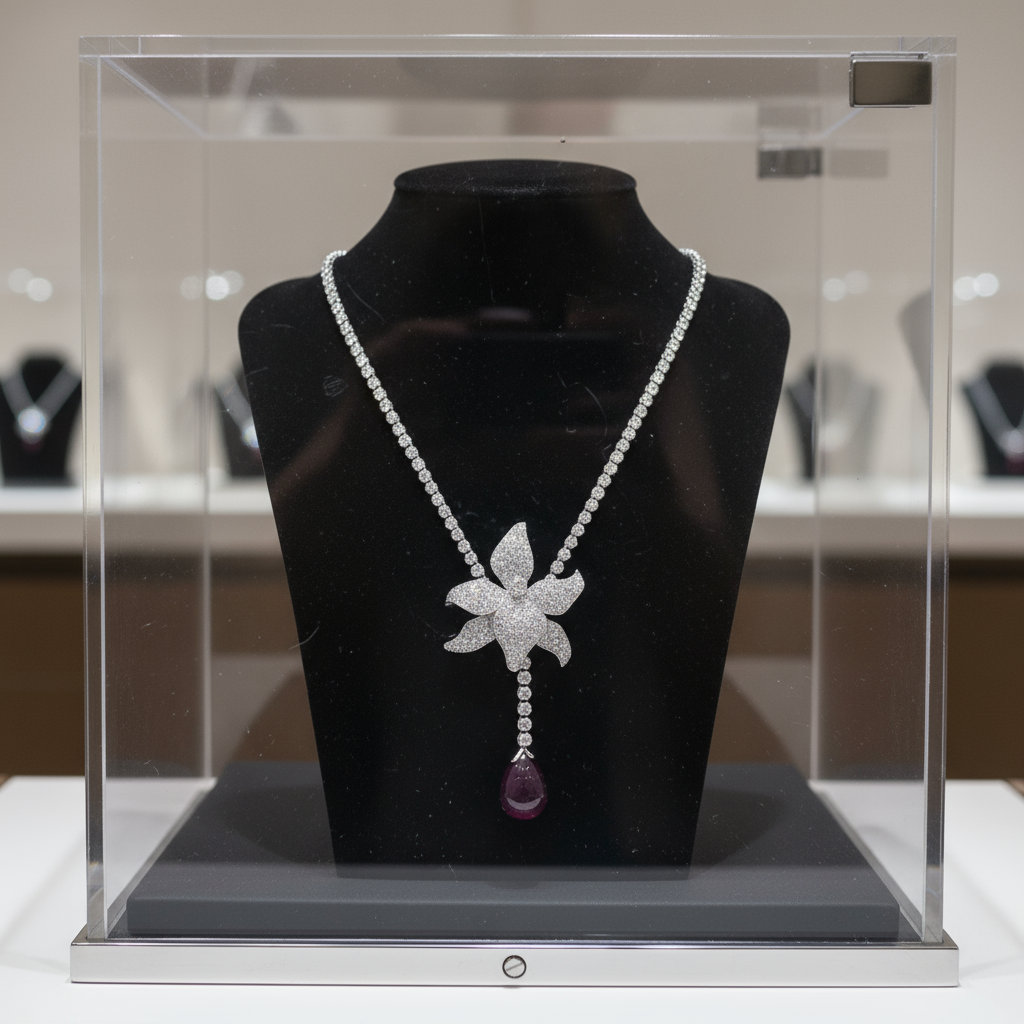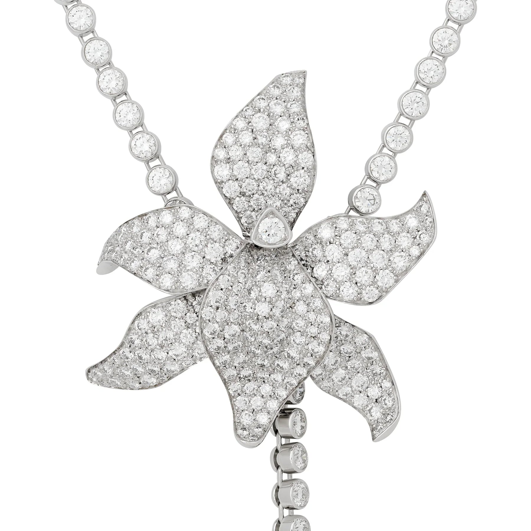 Embrace timeless elegance with this exquisite Cartier Caresse d'Orchidée necklace from the 1990s. Crafted in platinum, this adjustable design features delicate diamond and rubellite accents that evoke the graceful curves of an orchid bloom. A signature piece from Cartier's storied jewelry collection, it seamlessly transitions from day to evening wear. The refined craftsmanship and precious materials reflect the luxury and sophistication that defined the era's most coveted fine jewelry.