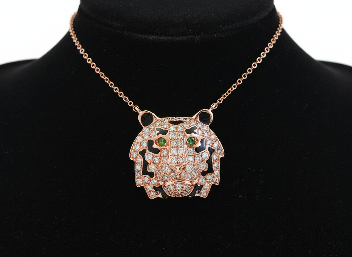Effy Tiger Necklace, Round Diamond 0.53 cttw H-I SI2-I1, 2 Tsavorite 0.02 cttw, Black Enamel, 14K Rose Gold