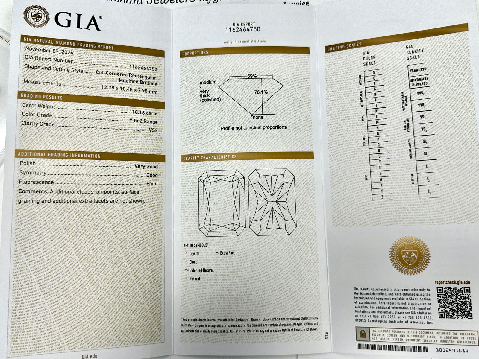 Jewelry Type : Ring Jewelry Style : Halo Metal Type : 14K White Gold Metal Weight : 10.92 grams Ring Size : 7 Brand : Estate Center Stone : Stone Type : Diamond Center Stone : Shape : Cushion Modified Center Stone : Stone Weight : 10.16 ct Center Stone : Quantity : 1 Center Stone : Color : Y-Z Center Stone : Clarity : VS2 Center Stone : Lab : GIA Center Stone : Cert. : 1162464750 Center Stone : Measurement : 12.79-10.48 mm Side Stone 1 : Stone Type : Diamond Side Stone 1 : Shape : Round Side Stone 1 : Stone Weight : 0.76 ct Side Stone 1 : Quantity : 64