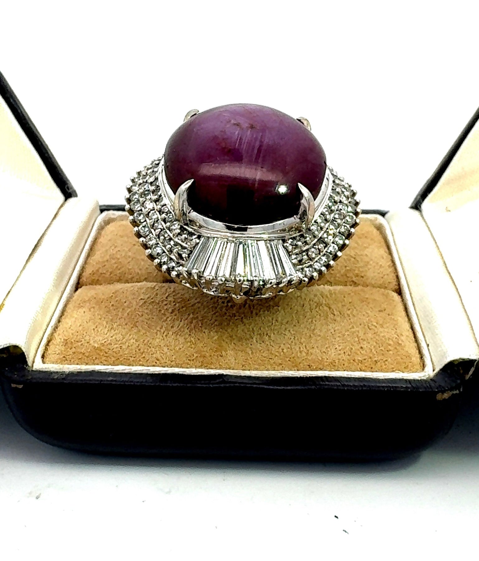 Estate Ring, Mixed Cut Diamond 3.25 cttw G-I VS2-SI1,1 Star Ruby Cabochon 46.89 ct Platinum White Gold 42.00g