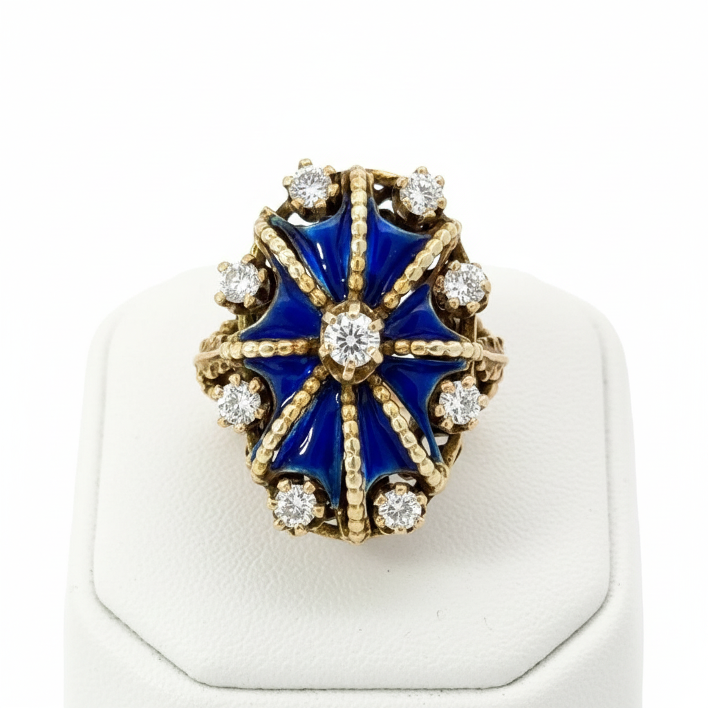 Estate Ring, 9 Old European Cut Diamond 1.00 cttw #Estimated Weight, Blue Enamel, 14K Yellow Gold