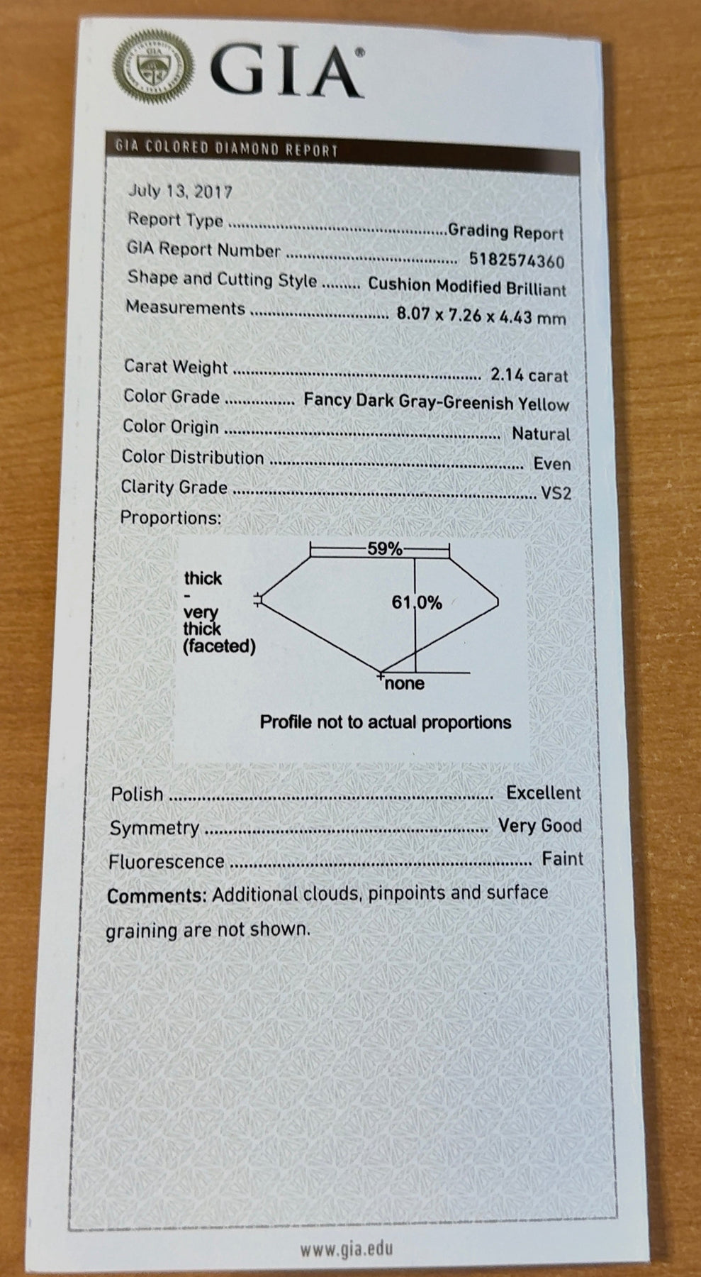 Estate - Michael M Ring, 1 Cushion Modified Diamond 2.14ct GIA #5182574360 Fancy Dark Grey-Greenish Yellow VS2, Round Diamond 1.70ct G-H VS1-VS2, 18K White Gold 12.00g (Original Cert)
