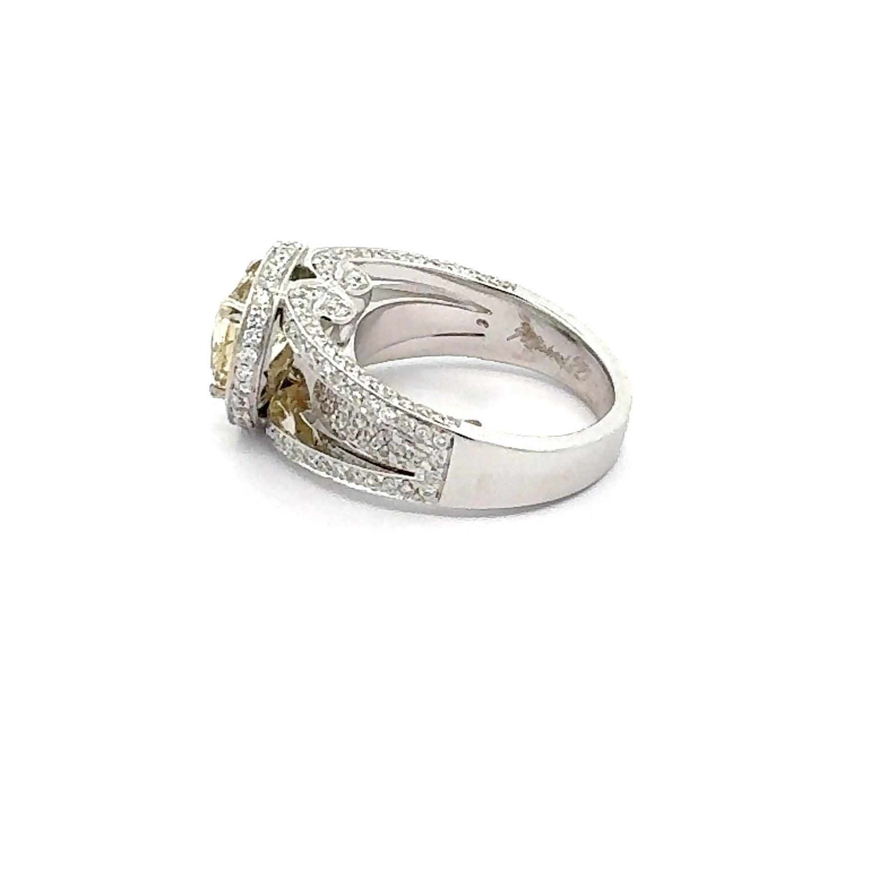 Jewelry Type : Ring Metal Type : 18K White Gold Metal Weight : 12.00 grams Ring Size : 6.50 Brand : Estate - Michael M Period : Modern 2000's Measurement : 12.5 x 12.7 mm Center Stone : Stone Type : Diamond Center Stone : Shape : Cushion Modified Center Stone : Stone Weight : 2.14 ct Center Stone : Quantity : 1 Center Stone : Color : FDGGY Center Stone : Clarity : VS2 Center Stone : Lab : GIA Center Stone : Cert. : 5182574360 Center Stone : Measurement : 7.26-8.07 mm Side Stone 1 : Stone Type : Diamond Side Stone 1 : Shape : Round Side Stone 1 : Stone Weight : 1.7 ct Side Stone 1 : Color : G-H Side Stone 1 : Clarity : VS1-VS2