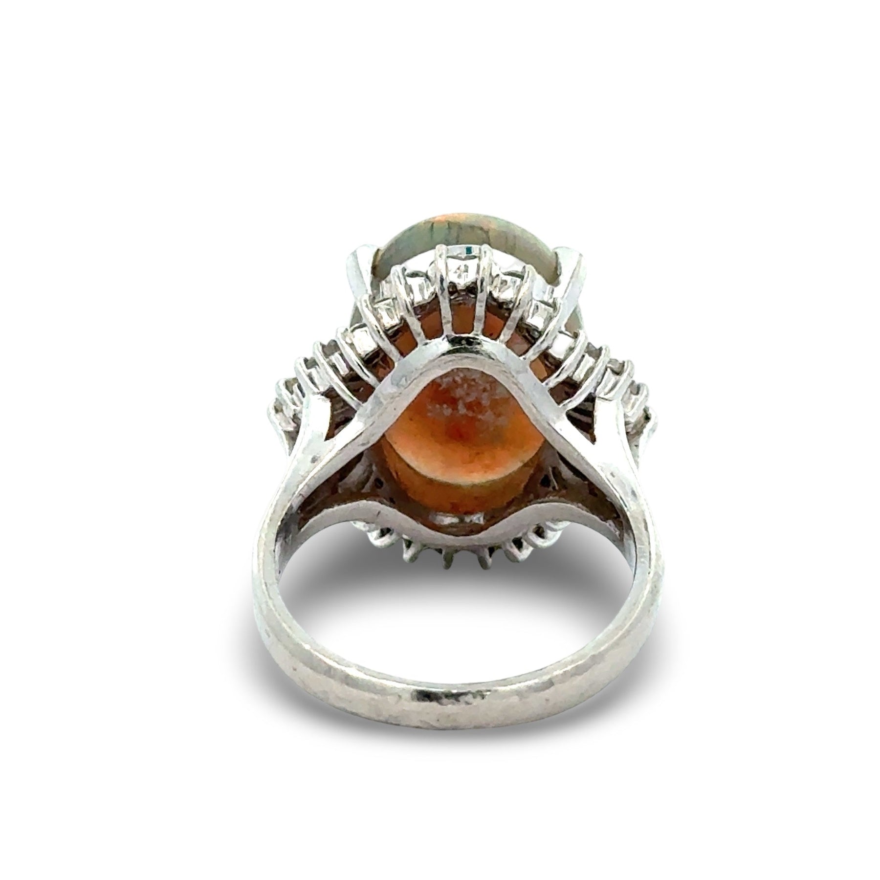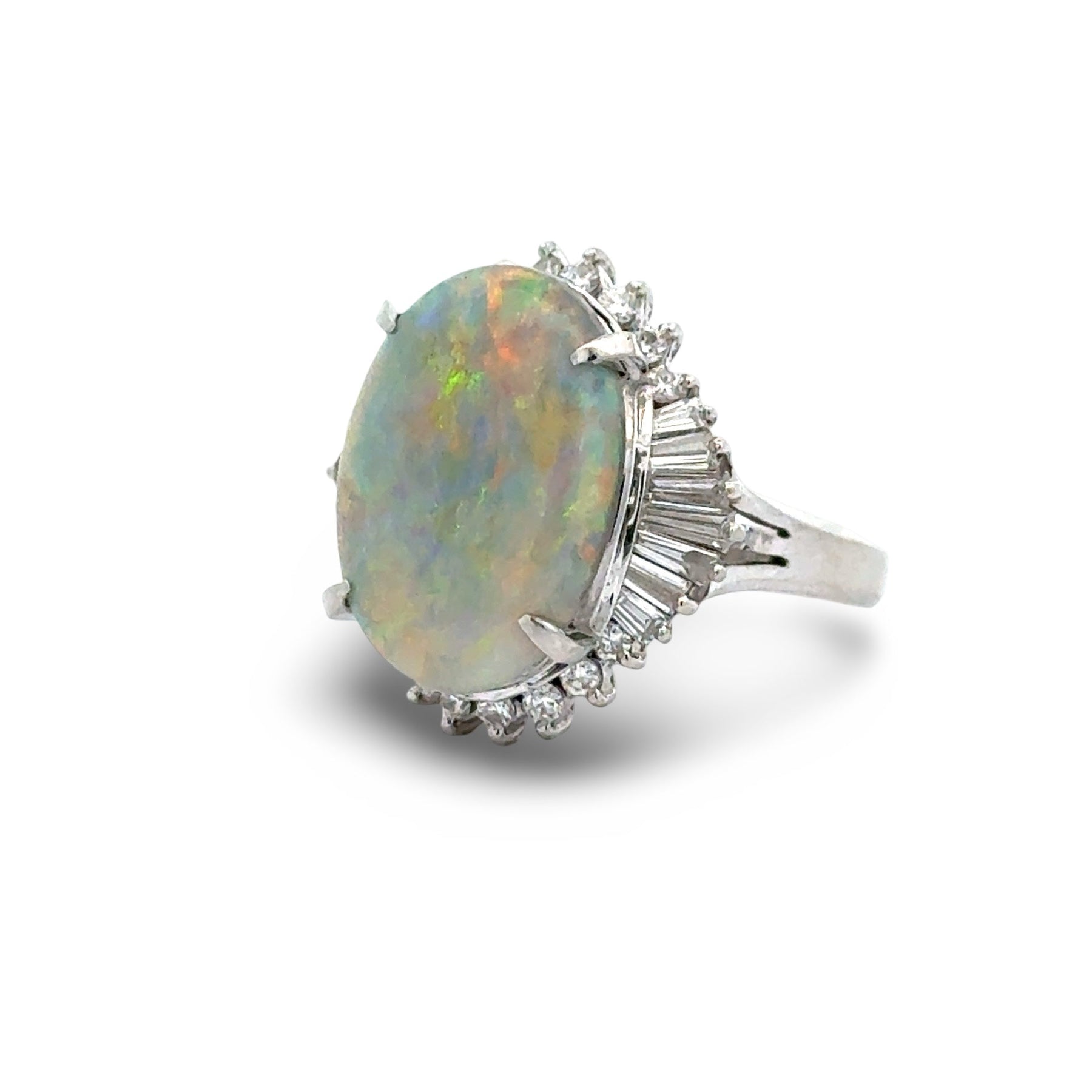 Jewelry Type : Ring Jewelry Style : Halo Metal Type : Platinum Ring Size : 4.25 Brand : Estate Measurement : 18.40x17.30mm Center Stone : Stone Type : Opal Center Stone : Shape : Oval Center Stone : Stone Weight : 4.23 ct Center Stone : Quantity : 1 Side Stone 1 : Stone Type : Diamond Side Stone 1 : Shape : Mixed Cut Side Stone 1 : Stone Weight : 0.61 ct Side Stone 1 : Quantity : 30 Side Stone 1 : Color : H-I Side Stone 1 : Clarity : VS1-SI1