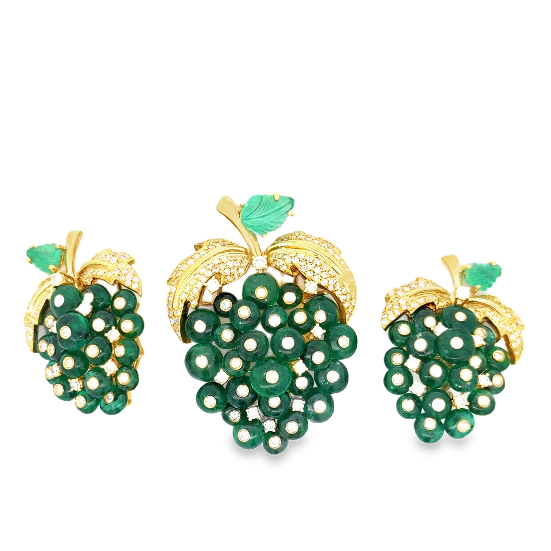 Jewelry Type : Brooch and Earrings Suite Metal Type : 18K White/Yellow Gold Total Weight : 67.90 grams Brand : Giovane Period : 1990's Side Stone 1 : Stone Type : Diamond Side Stone 1 : Shape : Round Brilliant Cut Side Stone 1 : Stone Weight : 4.2 ct Side Stone 1 : Color : F-G Side Stone 1 : Clarity : VS1-SI Side Stone 2 : Stone Type : Emerald Side Stone 2 : Shape : Cabochon Side Stone 2 : Stone Weight : 15 ct