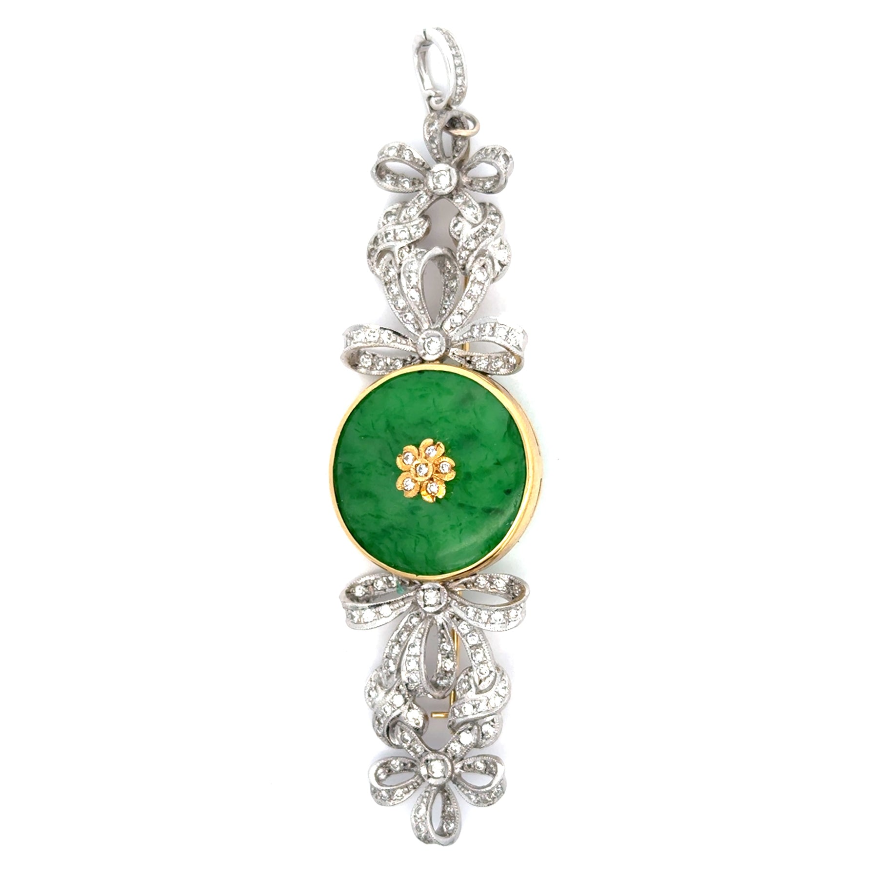 A masterwork of vintage revival, this 1970s creation draws inspiration from the geometric elegance of Art Deco and the refined opulence of the Edwardian era. Featuring luminous jade set within 18K yellow gold and platinum, accented by brilliant diamonds, this dual-function piece transitions effortlessly from pendant to brooch. Its versatile design honors classical periods while celebrating the craftsmanship of its own decade, making it a distinguished choice for those who appreciate jewelry that bridges eras with understated sophistication.