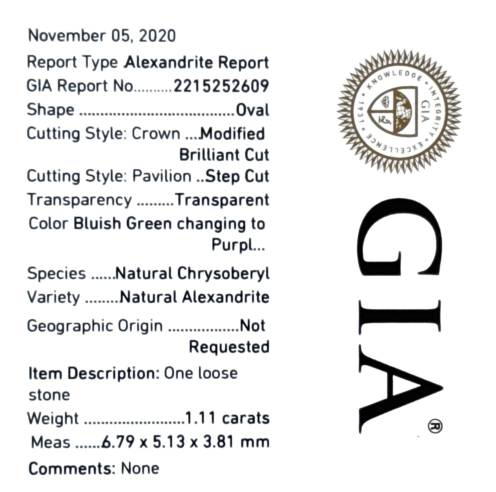 This exquisite pendant showcases a 1.11 carat natural alexandrite with the coveted color-change property, transitioning from bluish-green to purple hues. The oval-cut stone is GIA-certified, ensuring authenticity and quality. Set in 14K gold, the alexandrite is complemented by 0.25 carats of round brilliant-cut diamonds that enhance its brilliance. Measuring 16.06 x 8.10mm, this modern design from the 2000s captures the sophisticated appeal of one of nature's rarest gemstones, perfect for collectors and those seeking a distinctive, investment-quality piece.