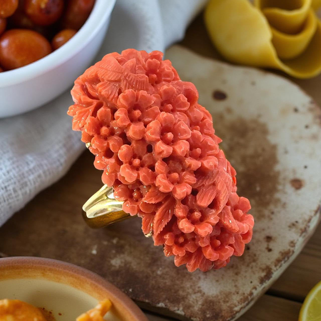 Jewelry Type : Ring Metal Type : 14K Yellow Gold Metal Weight : 31.87 grams Ring Size : 7.25 Brand : Estate Italy Period : Modern 1980's Measurement : gross weight Center Stone : Stone Type : Coral Center Stone : Shape : Freeform Center Stone : Quantity : 1 Center Stone : Measurement : 48-29 mm