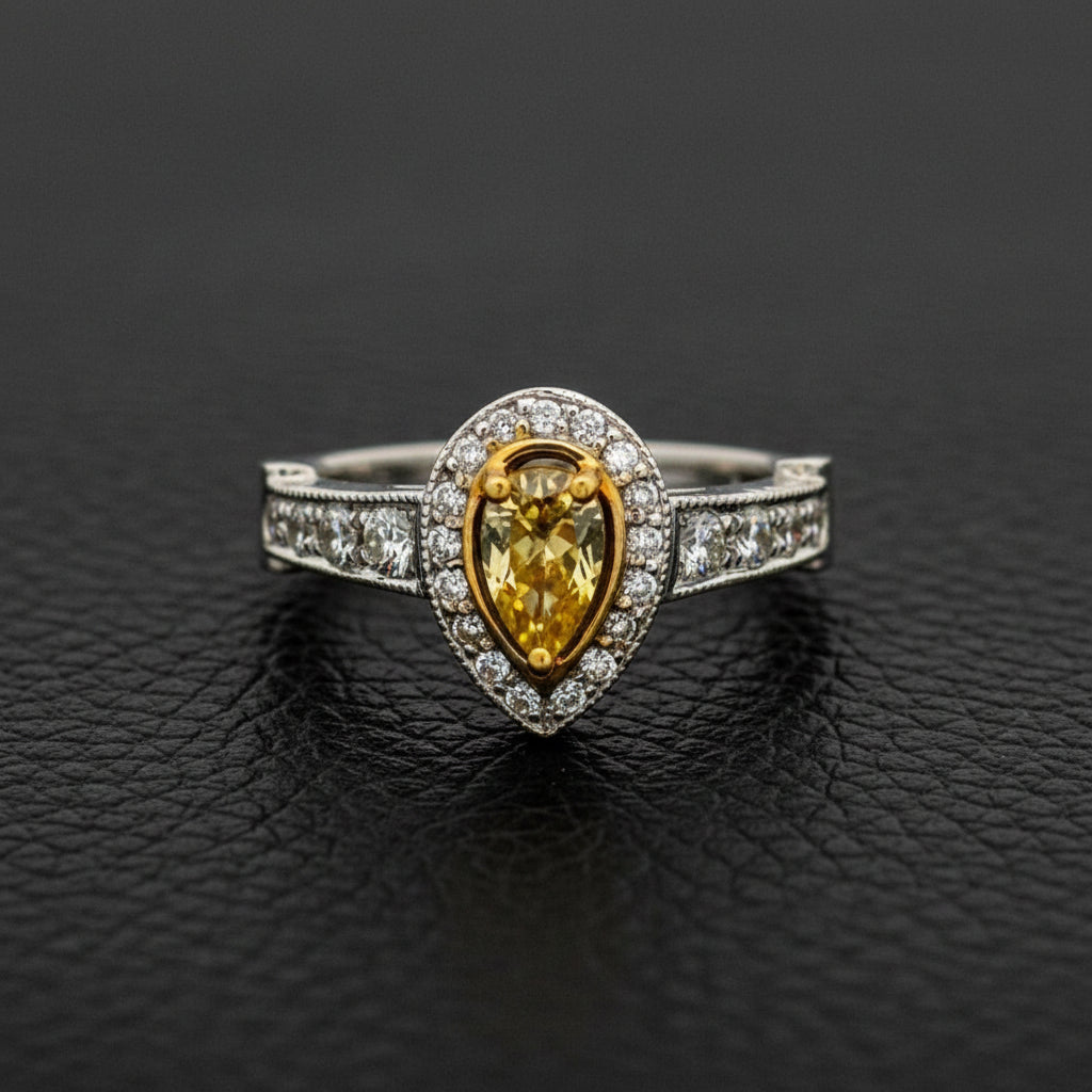 Jewelry Type : Ring Metal Type : 14K/18K White/Yellow Gold Total Weight : 5.5 grams Ring Size : 6.5 Brand : Estate Period : 1990's Center Stone : Stone Type : Diamond Center Stone : Shape : Pear Shape Center Stone : Stone Weight : 0.5 ct Center Stone : Quantity : 1 Center Stone : Color : FY Center Stone : Clarity : SI2