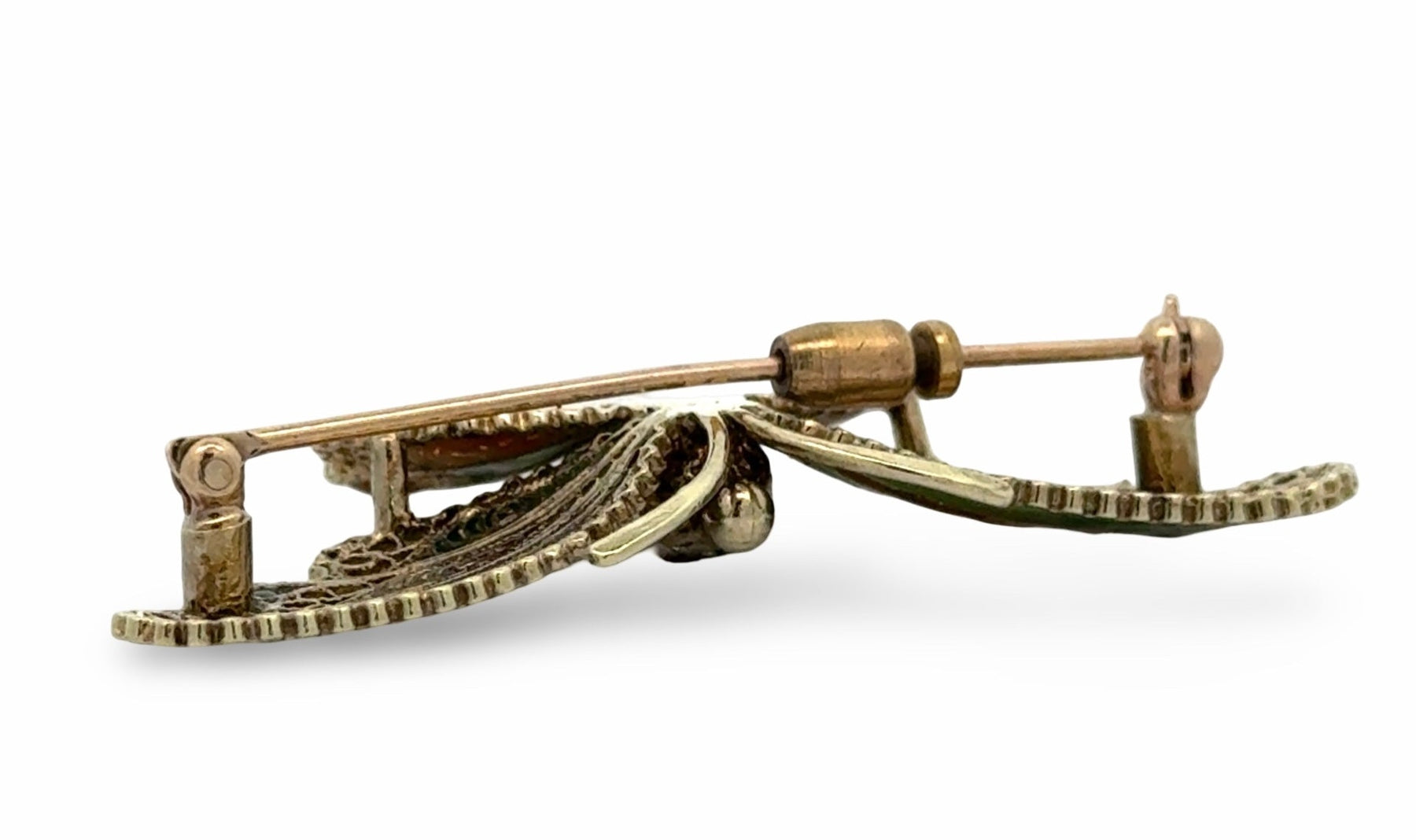 This exquisite brooch showcases a delicate butterfly crafted in 14K yellow gold, weighing 8.8 grams. Dating from the modern 1960s estate collection, it features a striking plique-à-jour enamel in vibrant green and orange hues that highlight the intricate design. Measuring 50 by 20 mm, this piece combines artistry with timeless elegance, making it a distinguished accessory for collectors and connoisseurs of vintage jewelry.