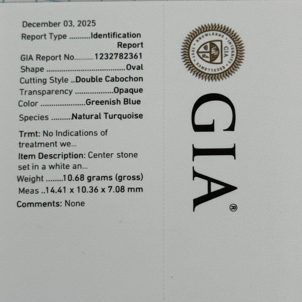 Jewelry Type : Ring Metal Type : 18K/PLAT Yellow Gold Ring Size : 4.25 w/ balls Brand : Estate Period : Modern 1970's Measurement : Top 19mm x 15mm Center Stone : Stone Type : Turquoise Center Stone : Shape : Cabochon Center Stone : Quantity : 1 Center Stone : Color : Greenish-Blue Center Stone : Certification : GIA Center Stone : Cert. : 1232782361 Center Stone : Measurement : 10.36-14.41 mm