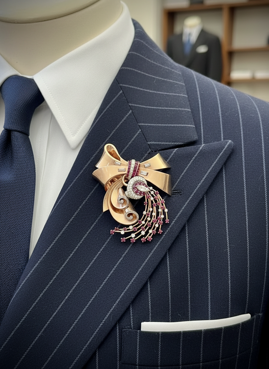 This exquisite Retro 1940's brooch features a striking 1.65-carat marquise-cut diamond of K color and VS2 clarity as its centerpiece. Surrounding it are an array of 4.05 carats of round and baguette-cut diamonds in H-L color and VS2-SI1 clarity, complemented by vibrant 5 carats of French-cut ruby in rich red to dark pink hues. Crafted in substantial 14K rose gold weighing 55.12 grams, this piece exemplifies vintage elegance and expert craftsmanship, perfect for collectors and connoisseurs seeking timeless luxury.