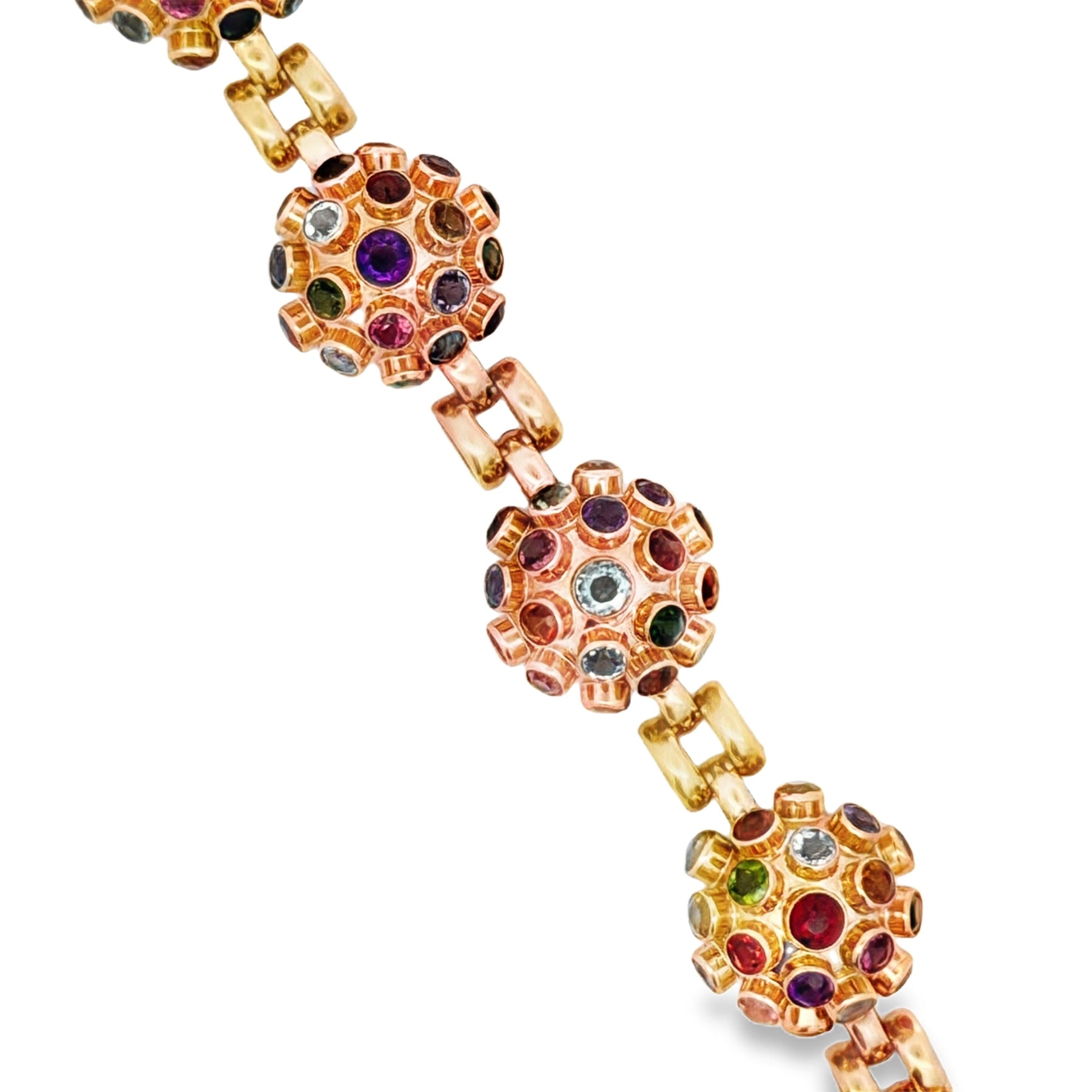 Jewelry Type : Ring, Earring, Bracelet, Pendant Suite Metal Type : 14K Rose Gold Total Weight : 45.09 grams Estate piece all weights estimated Period : Retro 1940's Measurement : Bracelet 6.75" Center Stone : Stone Type : Peridot Center Stone : Shape : Old European Cut Side Stone 1 : Stone Type : Amethyst Side Stone 1 : Shape : Old European Cut Side Stone 2 : Stone Type : Garnet Side Stone 2 : Shape : Old European Cut Side Stone 3 : Stone Type : Topaz Side Stone 3 : Shape : Old European Cut Side Stone 3 : Color : Blue Side Stone 4 : Stone Type : Tourmaline Side Stone 4 : Shape : Old European Cut Side Stone 4 : Color : Pink Side Stone 5 : Stone Type : Aquamarine Side Stone 5 : Shape : Old European Cut