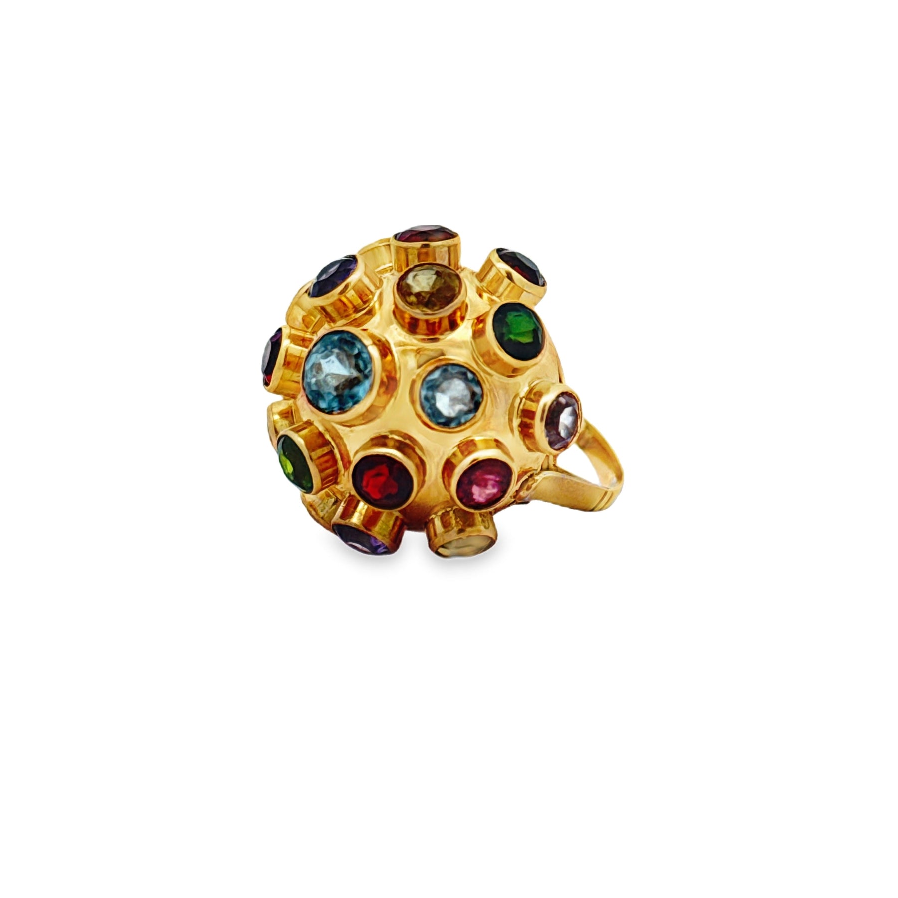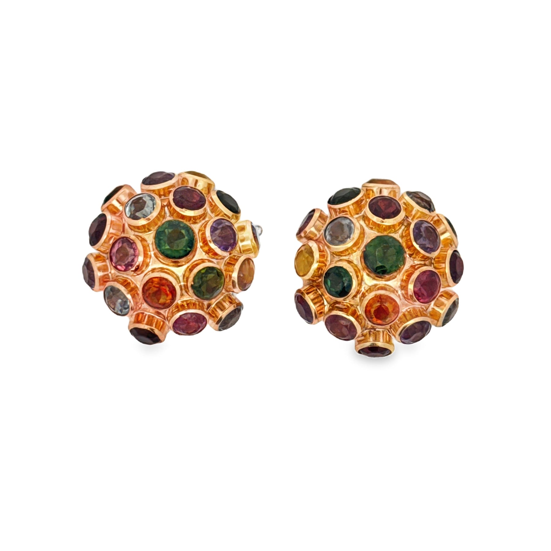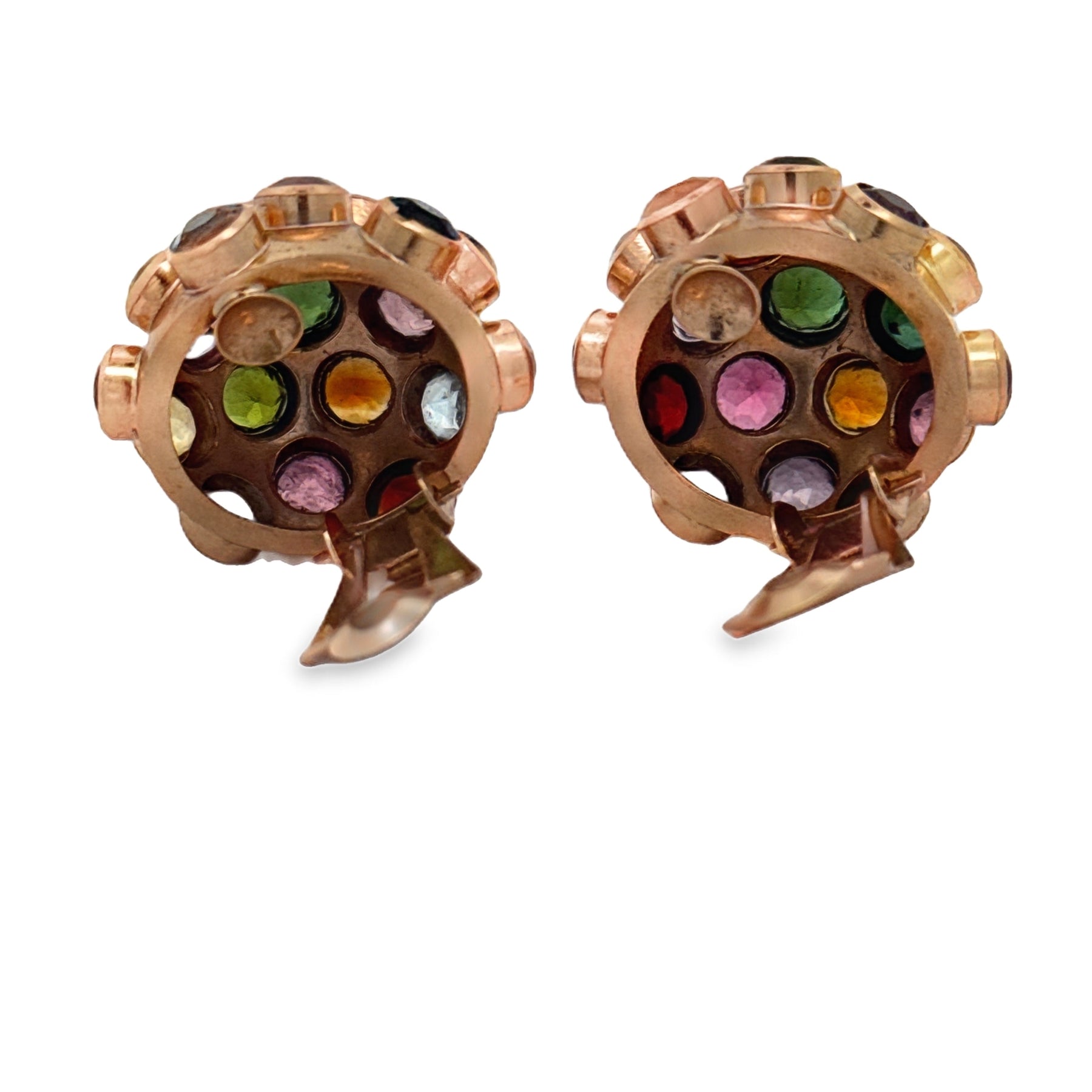 Complete your vintage collection with this stunning 1940s multi-gemstone jewelry set in 14kt rose gold. This coordinated ensemble includes matching earrings, pendant, ring, and bracelet, each piece adorned with a carefully curated selection of gemstones—peridot, amethyst, garnet, blue topaz, pink tourmaline, and aquamarine. Every stone is cut in the distinguished old European style, delivering exceptional sparkle and depth. The bracelet measures 6.75 inches for a comfortable fit. Together, these pieces capture the refined aesthetics of the retro era, offering a cohesive and sophisticated look that celebrates authentic vintage craftsmanship and timeless elegance.