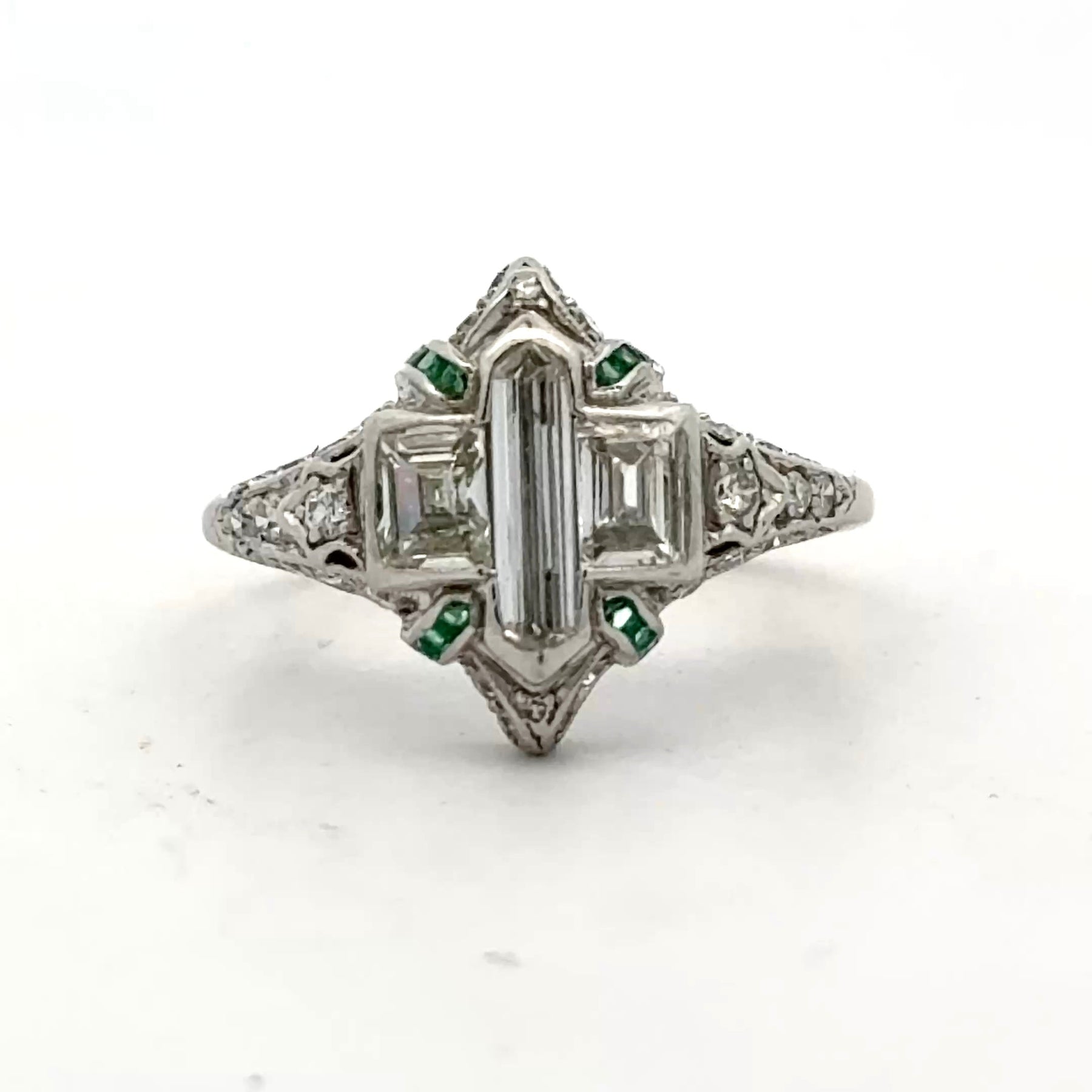 Jewelry Type : RingMetal Type : Platinum N/ATotal Weight : 3.60 gramsRing Size : 5Brand : Art DecoMeasurement : Top 13.04x17.40mmSide Stone 1 :Stone Type : DiamondShape : Baguette CutStone Weight : 0.8 ctQuantity : 3Color : I-KClarity : VVS-VS2Side Stone 2 :Stone Type : DiamondShape : Old European CutStone Weight : 0.6 ctQuantity : 32Color : G-HClarity : VVS-VS2Side Stone 3 :Stone Type : DiamondShape : Emerald CutStone Weight : 0.3 ctQuantity : 16