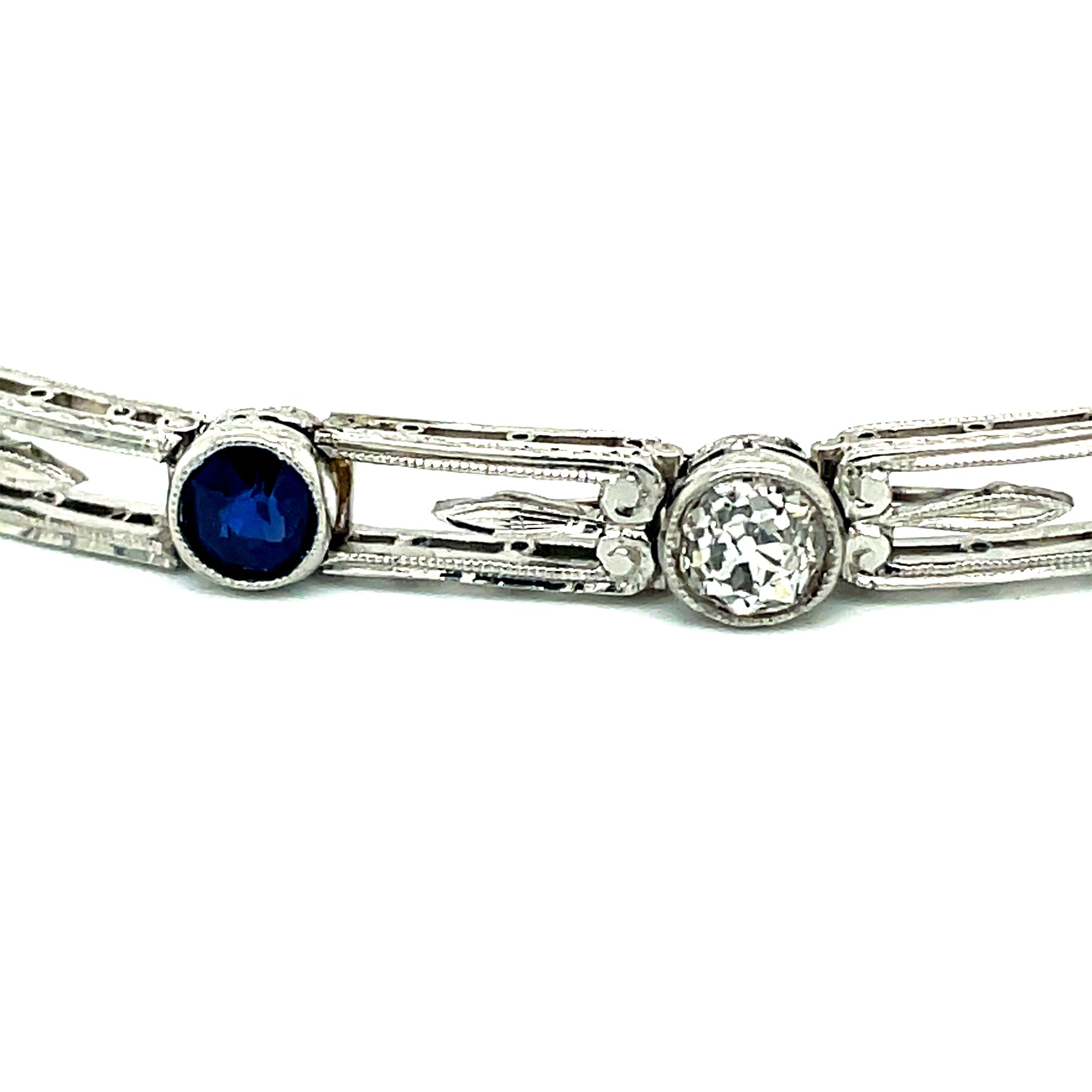 Jewelry Type : Bracelet Jewelry Style : Art Deco Metal Type : Platinum Metal Weight : 15.13 grams Brand : Estate Measurement : 7.10 inches Side Stone 1 : Stone Type : Diamond Side Stone 1 : Shape : Old European Cut Side Stone 1 : Stone Weight : 2.65 ct Side Stone 1 : Color : F-G Side Stone 1 : Clarity : VS1-VS2 Side Stone 2 : Stone Type : Sapphire Side Stone 2 : Shape : Round Side Stone 2 : Stone Weight : 2 ct