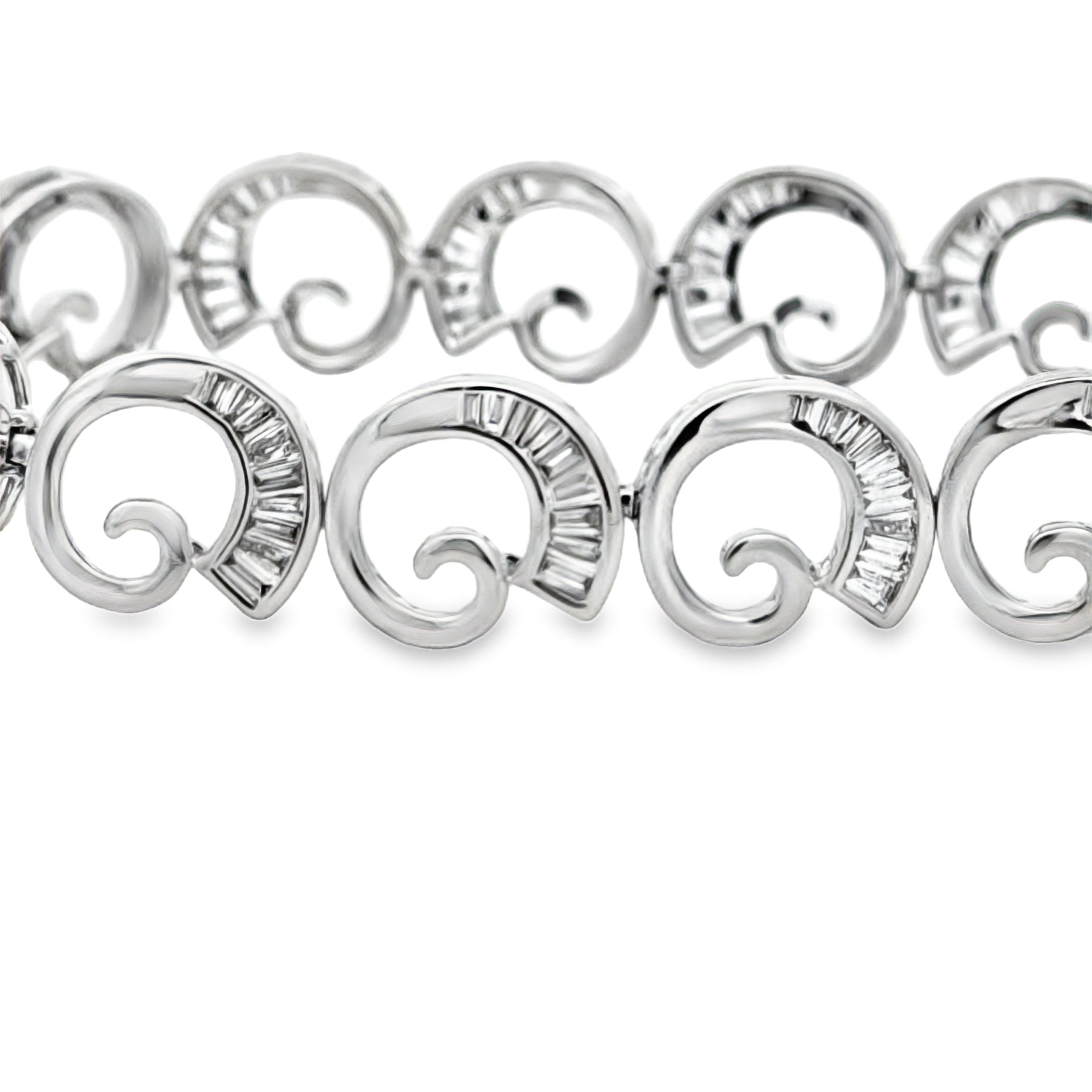This exquisite bracelet showcases a captivating swirl motif that dances across 14-karat white gold, creating an elegant interplay of light and movement. Set with 2.84 carats of diamonds, the design flows seamlessly around the wrist, combining sophisticated geometry with fluid artistry. The swirl pattern elevates the brilliance of each stone while maintaining a refined, wearable aesthetic. Perfect for those who appreciate distinctive designer craftsmanship and timeless luxury that transcends fleeting trends.