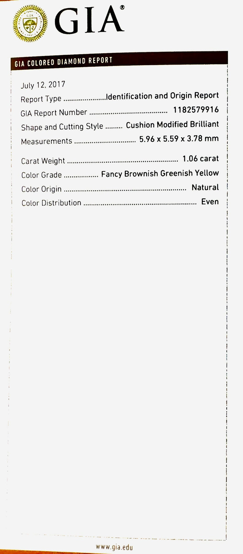 Estate Ring, 1 Cushion Modified Diamond 1.06ct GIA #1182579916 Fancy Brownish Greenish Yellow I1 (clarity not on cert), 132 Round Diamond 0.80ct G-H SI1-SI2, 18K White Gold 7.22g (Original Cert(