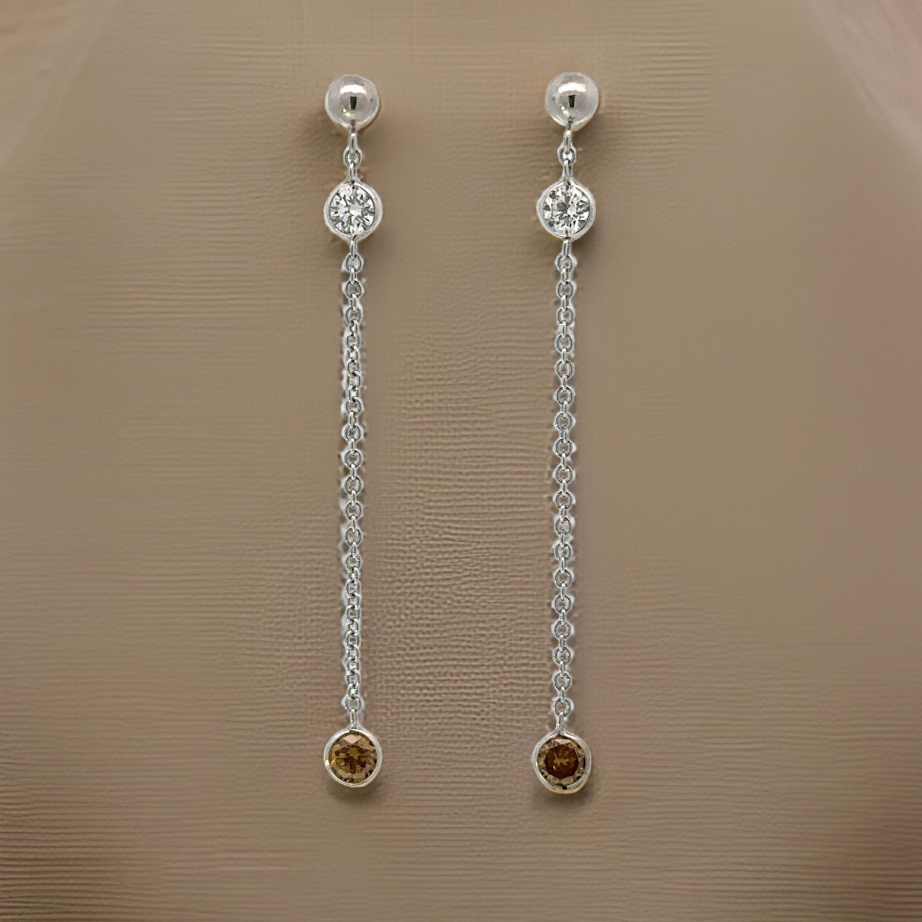 Maya Lianna Earrings, 2 Round Diamond 0.56 cttw G-H SI1-SI2, 2 Round Natural Fancy Orange Diamond 0.56 cttw VS2-SI1, 14K White Gold 1.11g