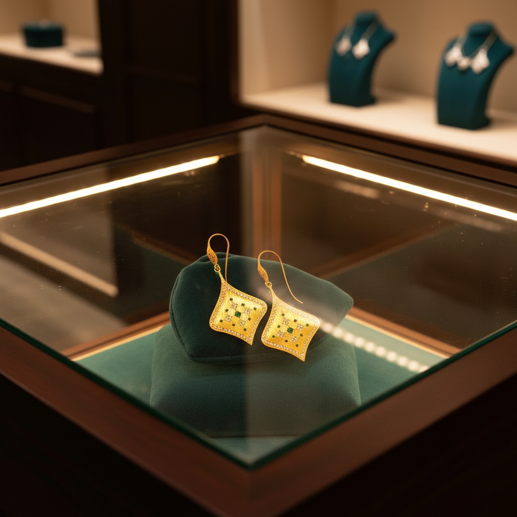 Estate Earrings, Round Brilliant Cut Diamond 1.15 ct G-H SI1-SI2,18 Emerald Round 0.27 ct 18K Yellow Gold 8.41g