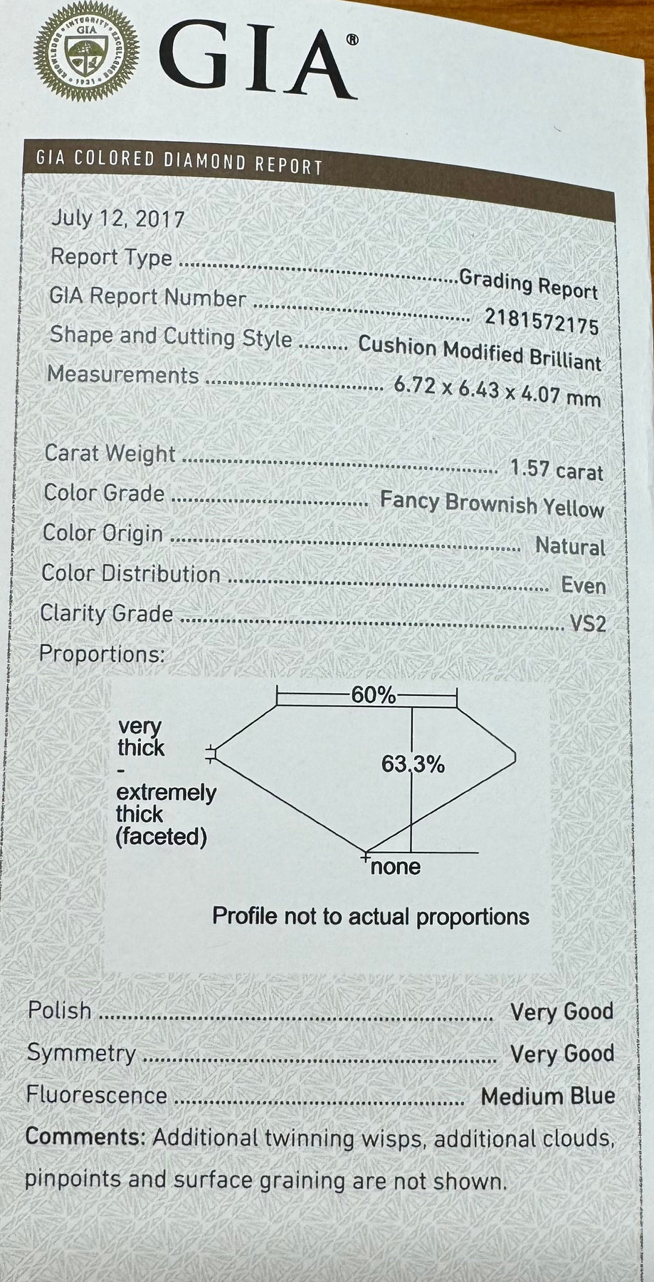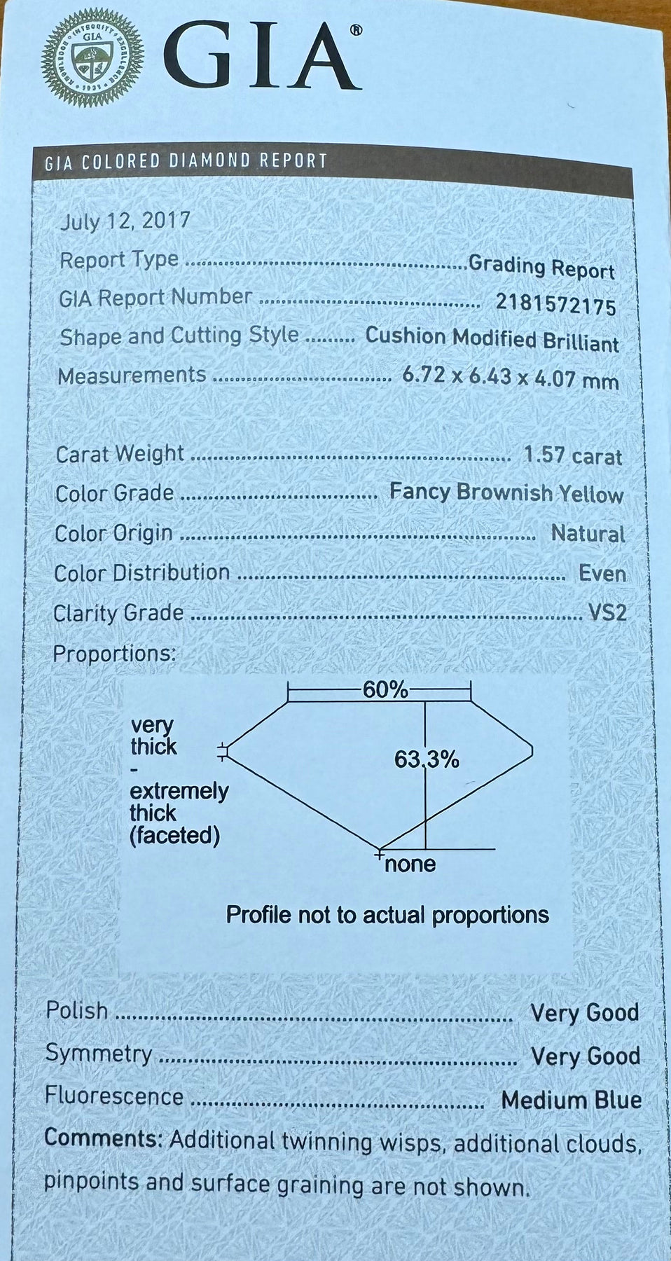 Jewelry Type : Earrings Metal Type : 14K Rose Gold Metal Weight : 2.50 grams Brand : Maya Lianna Period : Modern 2000's Measurement : 8.3 x 8.3 mm Center Stone : Stone Type : Diamond Center Stone : Shape : Cushion Modified Center Stone : Stone Weight : 1.5 ct Center Stone : Quantity : 1 Center Stone : Color : FBY Center Stone : Clarity : VS1 Center Stone : Lab : GIA Center Stone : Cert. : 6183574208 Center Stone : Measurement : 6.15-6.41 mm Side Stone 1 : Stone Type : Diamond Side Stone 1 : Shape : Cushion Modified Side Stone 1 : Stone Weight : 1.57 ct Side Stone 1 : Quantity : 1 Side Stone 1 : Color : FBY Side Stone 1 : Clarity : VS2