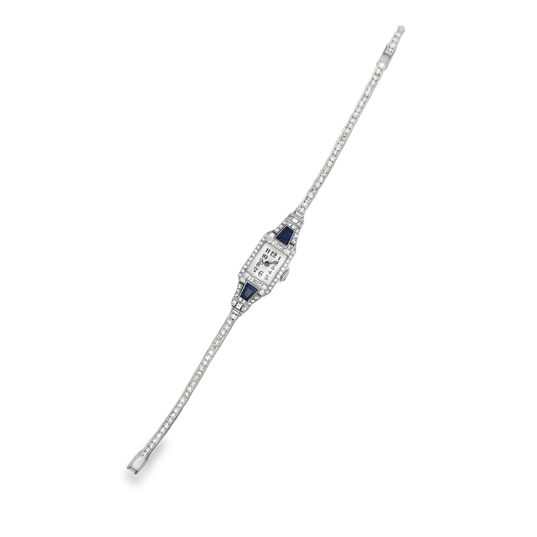 Art Deco Diamond and Burma Sapphire Platinum Watch A distinguished timepiece exemplifying early 20th-century design excellence. This platinum watch features authentic Burma sapphires and diamonds set in meticulous Art Deco styling, characteristic of the era's geometric precision and luxurious craftsmanship. The piece demonstrates the hallmarks of fine watchmaking from its period, with carefully calibrated movement and enduring construction. Ideal for collectors who appreciate historical horology and refined aesthetic sensibility. In working condition.