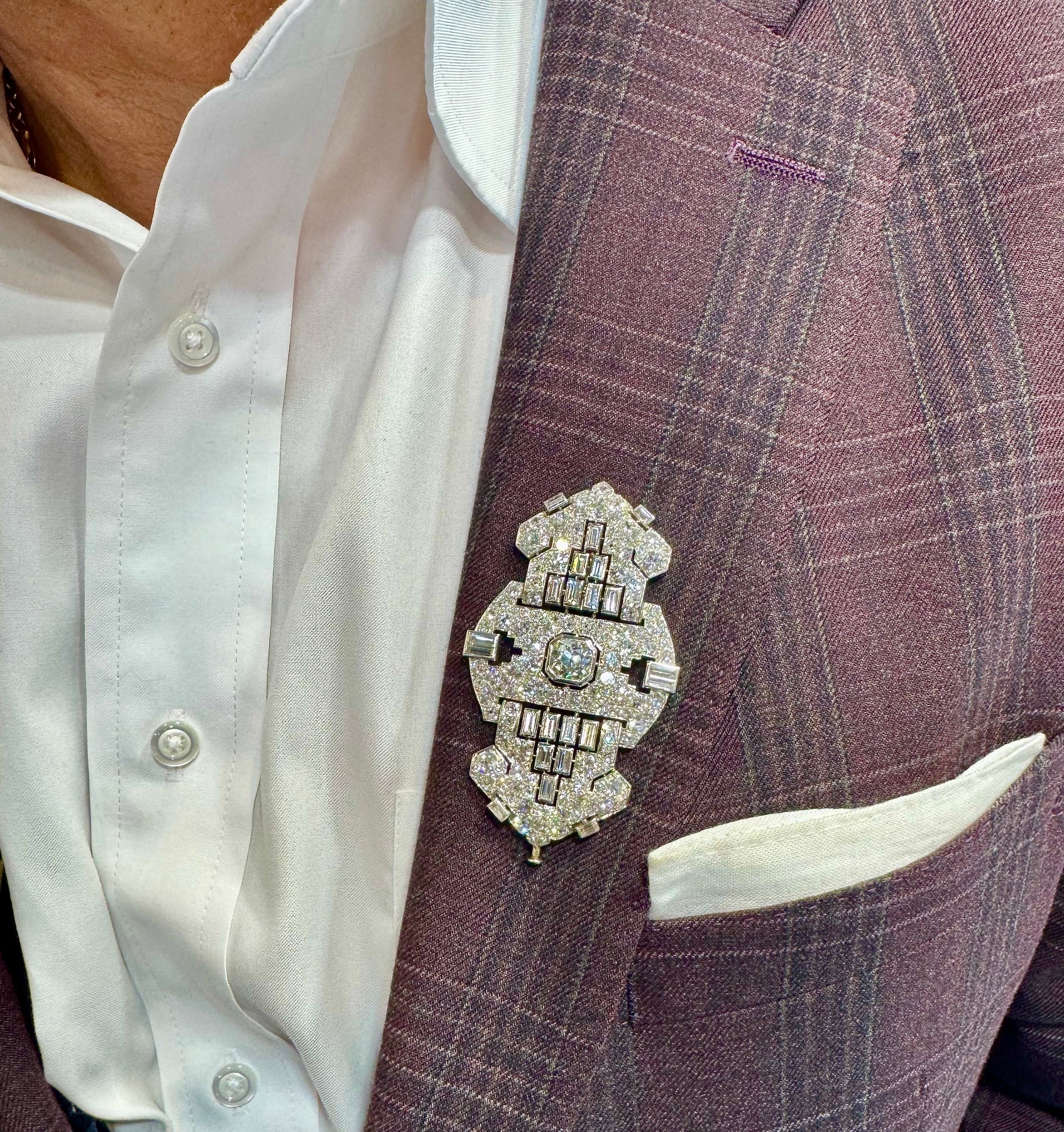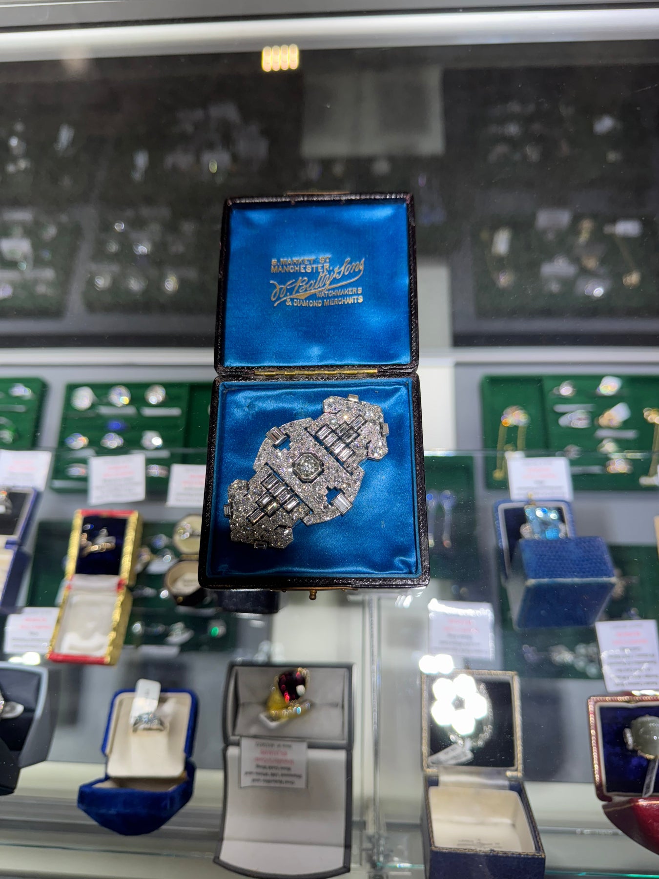 Jewelry Type : Brooch Metal Type : Platinum/18K White Gold Metal Weight : 26.52 grams Brand : Estate Period : Art Deco 1920's Measurement : 2.75 x 1.57" Center Stone : Stone Type : Diamond Center Stone : Shape : Old European Cut Center Stone : Stone Weight : 2.5 ct Center Stone : Quantity : 1 Center Stone : Color : J-K Center Stone : Clarity : VS1 Center Stone : Cert. : Estimated Weight Side Stone 1 : Stone Type : Diamond Side Stone 1 : Shape : Mixed Cut Side Stone 1 : Stone Weight : 15 ct Side Stone 1 : Quantity : 158 Side Stone 1 : Color : J-K Side Stone 1 : Clarity : VS1-SI2