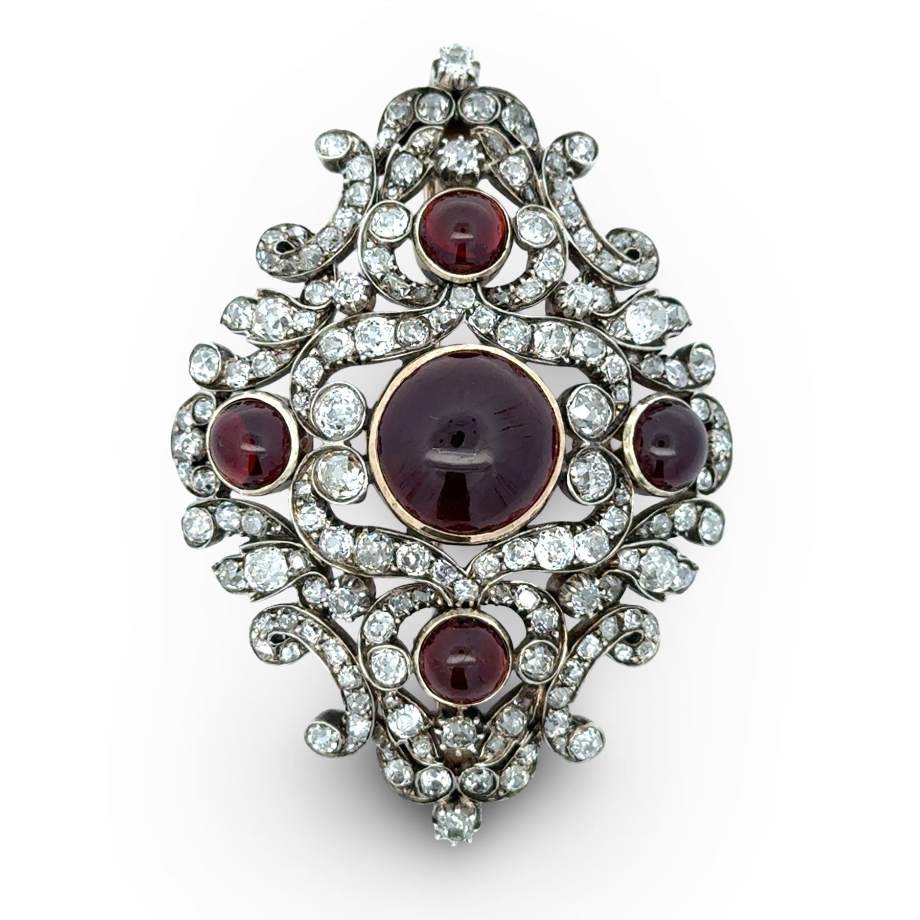 Jewelry Type : Brooch/Pendant Metal Type : 14K/Silver Yellow Gold Metal Weight : 20.70 grams Brand : Estate Period : Victorian 1880's Measurement : 59.22 x 40.58mm Side Stone 1 : Stone Type : Diamond Side Stone 1 : Shape : Old European Cut Side Stone 1 : Stone Weight : 10 ct Side Stone 1 : Color : H-J Side Stone 1 : Clarity : VS1-VS2 Side Stone 2 : Stone Type : Garnet Side Stone 2 : Shape : Cabochon Side Stone 2 : Stone Weight : 9 ct Side Stone 2 : Quantity : 5