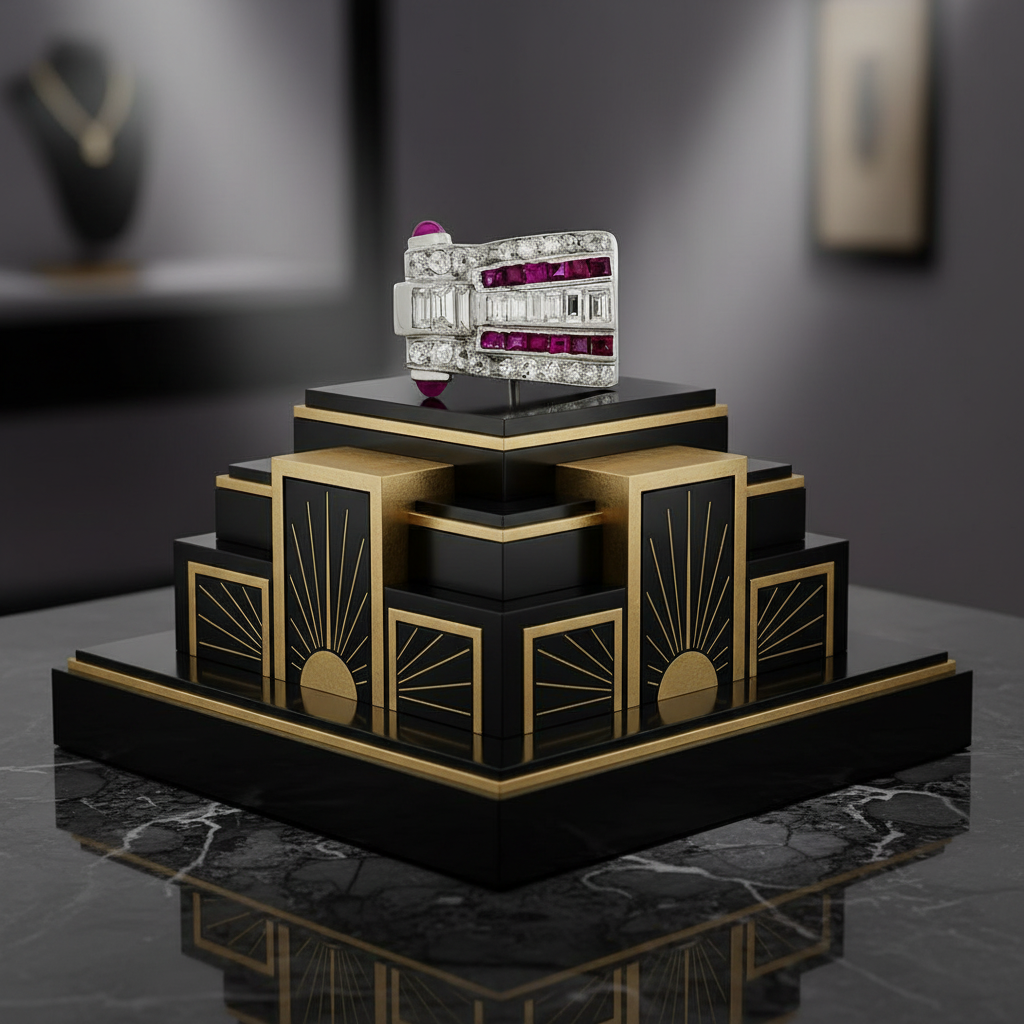 Jewelry Type : Ring Metal Type : Platinum Metal Weight : 15.87 grams Ring Size : 5 Brand : Estate Period : 1935 Side Stone 1 : Stone Type : Diamond Side Stone 1 : Shape : Baguette Cut Side Stone 1 : Stone Weight : 1.25 ct Side Stone 1 : Color : I-J Side Stone 1 : Clarity : VS2-SI1 Side Stone 2 : Stone Type : Ruby Side Stone 2 : Shape : French Cut Side Stone 2 : Stone Weight : 0.75 ct Side Stone 2 : Quantity : 14