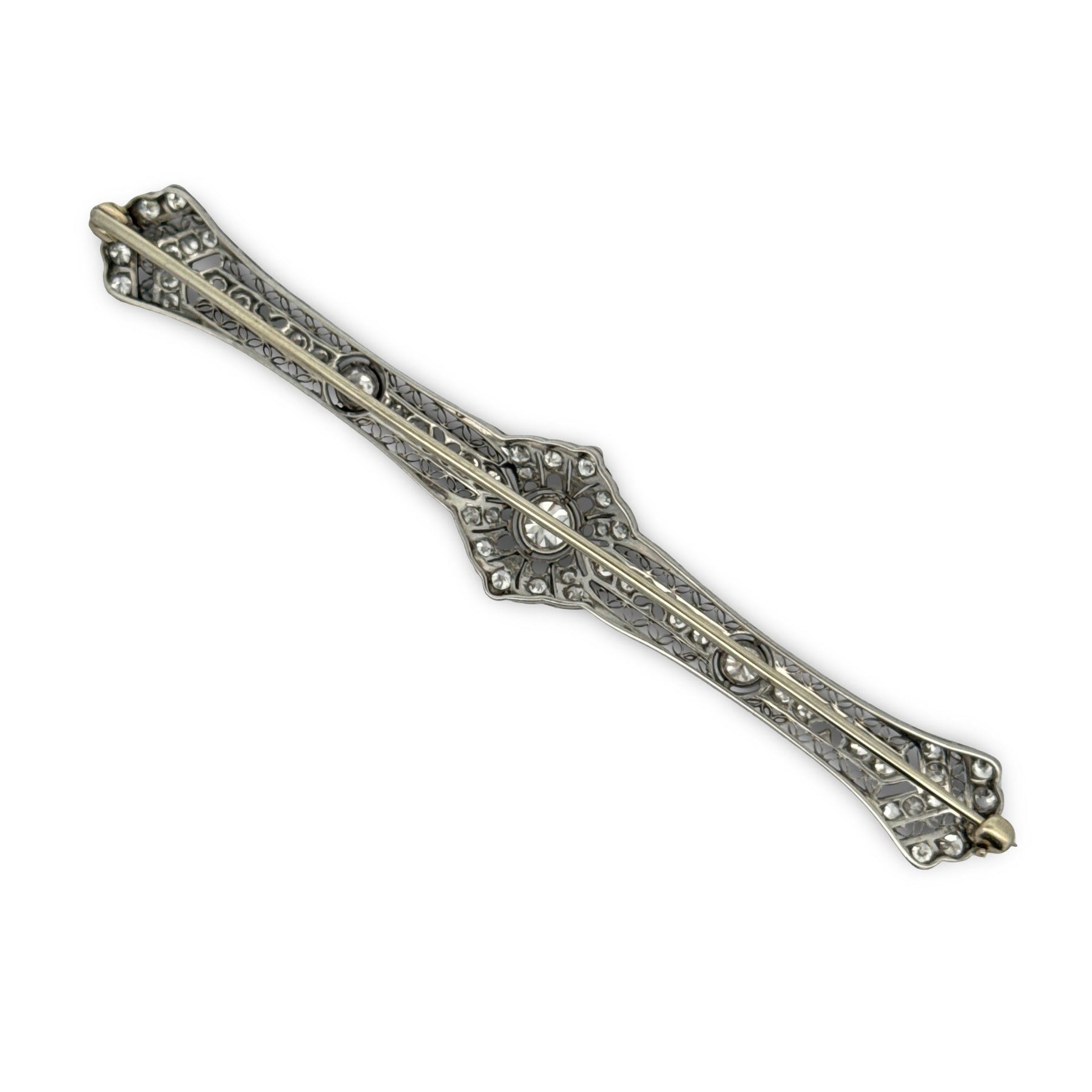 This exquisite Art Deco brooch/pendant from the 1920s features a stunning 1.50 carat total weight of Old European cut diamonds, graded G-H in color and VS1-SI1 in clarity, set in a refined 10.04 gram platinum frame. Measuring 3.42 inches by 0.05 inches, this piece exemplifies period craftsmanship and design, combining vintage elegance with enduring value, ideal for collectors and connoisseurs seeking timeless sophistication.