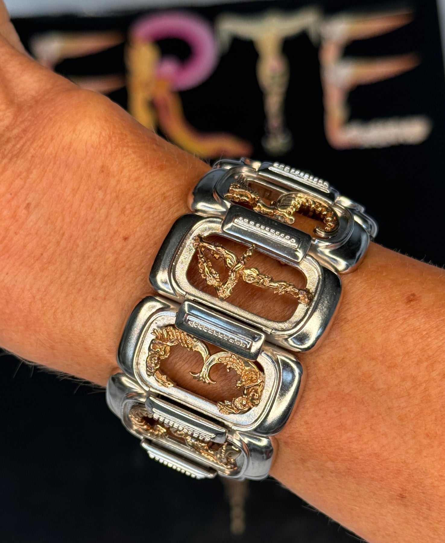 Erté (Romain de Tirtoff, 1892–1990) is a renowned artist known as "The Father of Art Deco". He began designing jewelry much later in life. According to several reputable sources, he embarked on a career as a jewelry designer at age 86. His late-life jewelry creations were conceived as “Art to Wear,” meticulously made with precious stones and inspired by themes like the nautical world, peacocks, and Egyptian culture. He produced around 328 limited-edition jewelry designs. Erté "The Numerals" 14K Gold and Sterling Silver Bracelet showcases a refined blend of artistry and craftsmanship. Inspired by Erté’s later graphic series and his original lithographs, this bracelet features elegant numerals rendered in 14K gold contrasted with sterling silver. It honors the iconic Art to Wear tradition with exquisite detail, making it both a wearable masterpiece and a celebration of Erté’s enduring legacy in design.