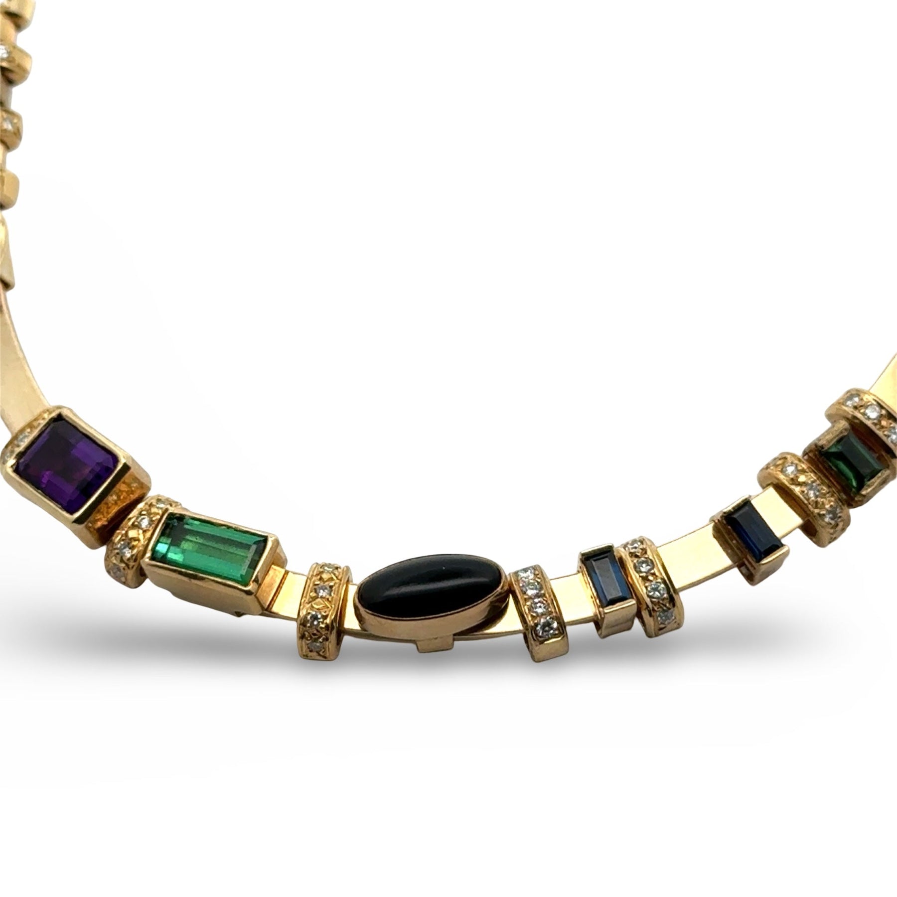 Jewelry Type : Necklace Metal Type : 14K/18K Yellow Gold Metal Weight : 66.79 grams Brand : Estate Period : Modern 1980's Measurement : 17" Side Stone 1 : Stone Type : Pearl Side Stone 1 : Shape : Mabe Side Stone 2 : Stone Type : Diamond Side Stone 2 : Shape : Round Brilliant Cut Side Stone 2 : Stone Weight : 1.1 ct Side Stone 2 : Quantity : 55 Side Stone 2 : Color : G-H Side Stone 2 : Clarity : VS1-SI1 Side Stone 3 : Stone Type : Sapphire Side Stone 3 : Shape : Baguette Cut Side Stone 3 : Stone Weight : 1.68 ct Side Stone 3 : Quantity : 4 Side Stone 4 : Stone Type : Tourmaline Side Stone 4 : Shape : Baguette Cut Side Stone 4 : Stone Weight : 2.25 ct Side Stone 4 : Quantity : 3 Side Stone 4 : Color : Green Side Stone 5 : Stone Type : Amethyst Side Stone 5 : Shape : Emerald Cut Side Stone 5 : Stone Weight : 3.52 ct Side Stone 5 : Quantity : 1