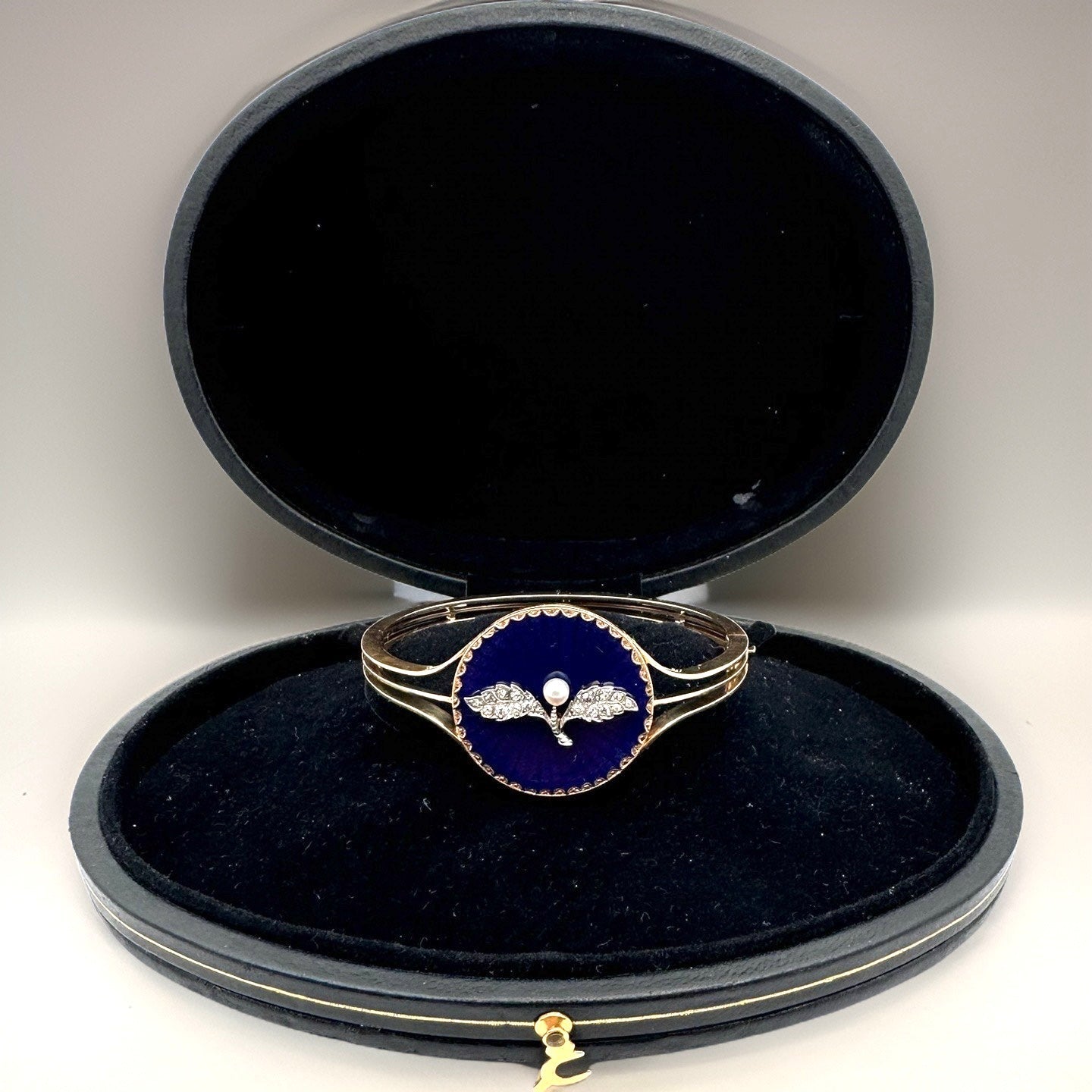 Estate Bangle, 16 Old Mine Cut Diamond 0.40 cttw H-I SI1-SI2 (weights estimated), 1 Round Natural Pearl 3.92mm, Blue Enamel, 14K Yellow Gold 30.00g