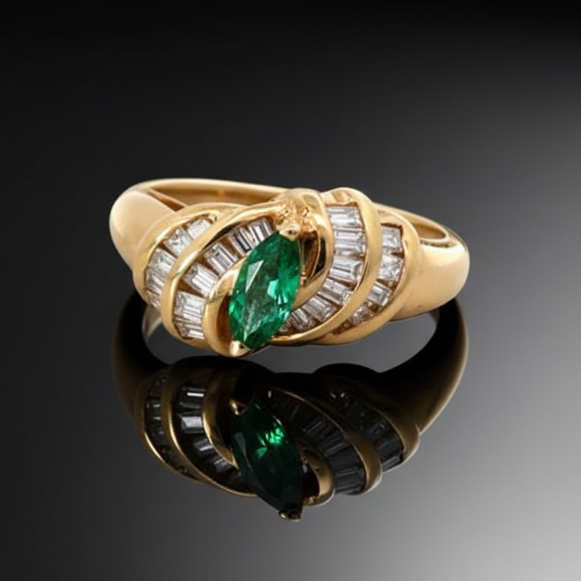 Jewelry Type : Ring Jewelry Style : Designer Metal Type : 14K Yellow Gold Metal Weight : 4.93 grams Ring Size : 6 Brand : Aurum Center Stone : Stone Type : Emerald Center Stone : Shape : Marquise Center Stone : Stone Weight : 0.37 ct Center Stone : Quantity : 1 Side Stone 1 : Stone Type : Diamond Side Stone 1 : Shape : Round Side Stone 1 : Stone Weight : 0.57 ct Side Stone 1 : Color : H-I Side Stone 1 : Clarity : VS2-SI1