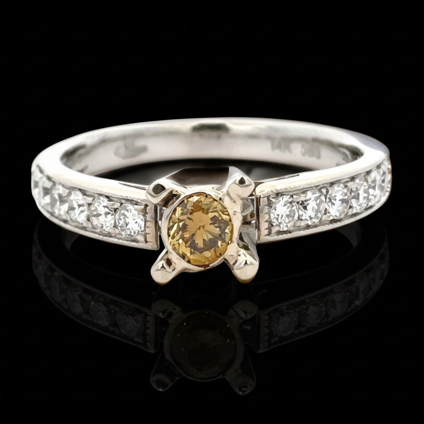 Jewelry Type : Ring Metal Type : 14K White Gold Metal Weight : 2.88 grams Ring Size : 6.25 Brand : Maya Lianna Center Stone : Stone Type : Fancy Color Diamond Center Stone : Shape : Round Center Stone : Stone Weight : 0.28 ct Center Stone : Quantity : 1 Center Stone : Color : Orange Center Stone : Clarity : VS2-SI1