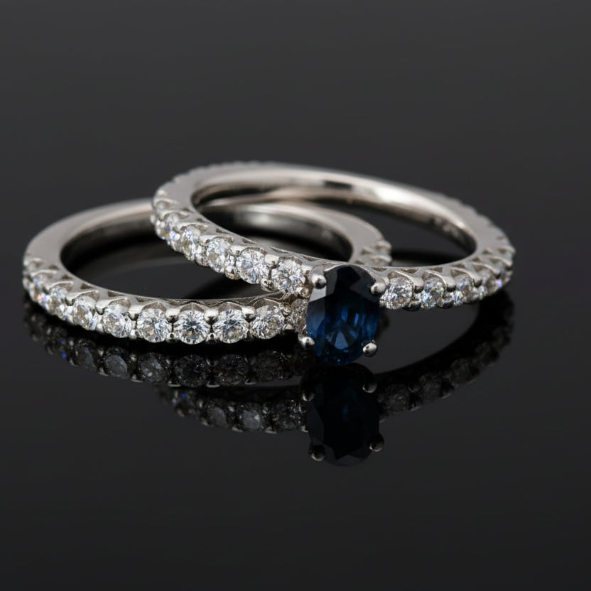 Jewelry Type : Ring Metal Type : 14K White Gold Metal Weight : 5.03 grams Ring Size : 6.50 Brand : Maya Lianna Center Stone : Stone Type : Sapphire Center Stone : Shape : Oval Center Stone : Stone Weight : 0.59 ct Center Stone : Quantity : 1 Side Stone 1 : Stone Type : Diamond Side Stone 1 : Shape : Round Side Stone 1 : Stone Weight : 0.9 ct Side Stone 1 : Quantity : 26 Side Stone 1 : Color : G-H Side Stone 1 : Clarity : SI1-SI2