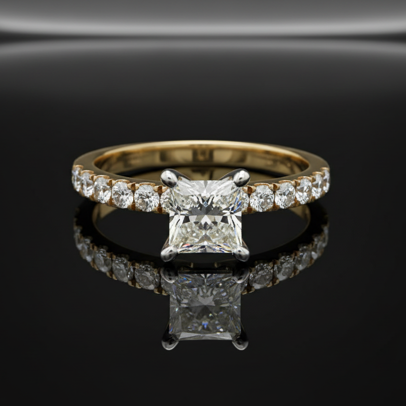 Jewelry Type : Ring Metal Type : 14K Yellow Gold Metal Weight : 2.75 grams Ring Size : 6.25 Brand : Venetti Center Stone : Stone Type : Diamond Center Stone : Shape : Princess Center Stone : Stone Weight : 0.69 ct Center Stone : Quantity : 1 Center Stone : Color : I-J Center Stone : Clarity : SI2 Side Stone 1 : Stone Type : Diamond Side Stone 1 : Shape : Round Side Stone 1 : Stone Weight : 0.39 ct Side Stone 1 : Quantity : 12