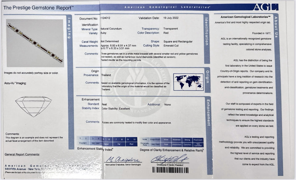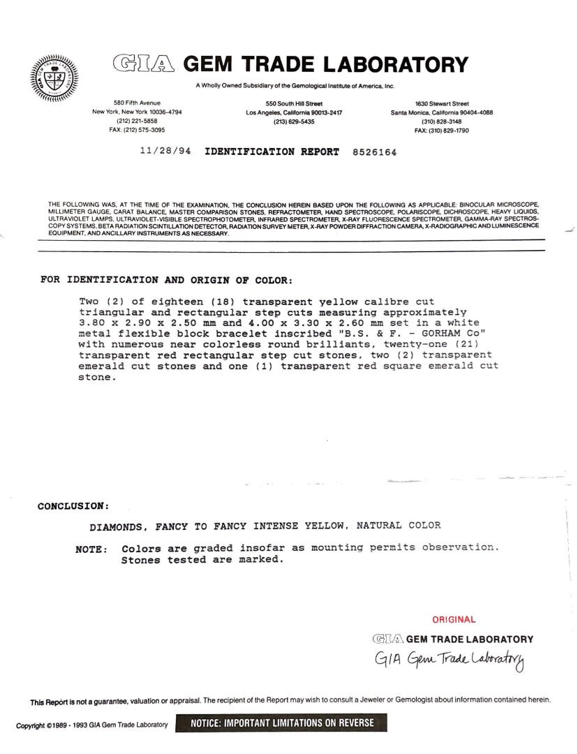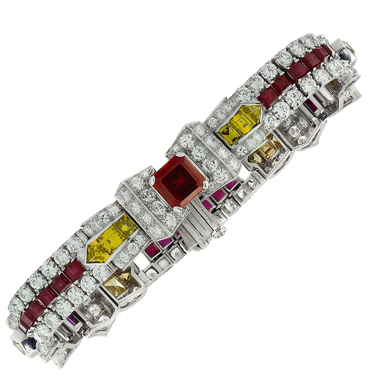 This exquisite London Estate Art Deco bracelet by Black Star Frost showcases a masterful blend of gems set in fine platinum. Featuring an impressive total diamond weight of over 11 carats—including 7.3 carats of round F-G VS1-SI1 diamonds and 3.7 carats of mixed-shaped fancy yellow diamonds (FY Fancy VS1-SI1)—it radiates exceptional brilliance. The design is further enhanced by three square rubies totaling 5 carats, adding vibrant color to this 1925-era piece. Weighing 42.22 grams and measuring 7 inches, this bracelet exemplifies refined craftsmanship and timeless elegance.