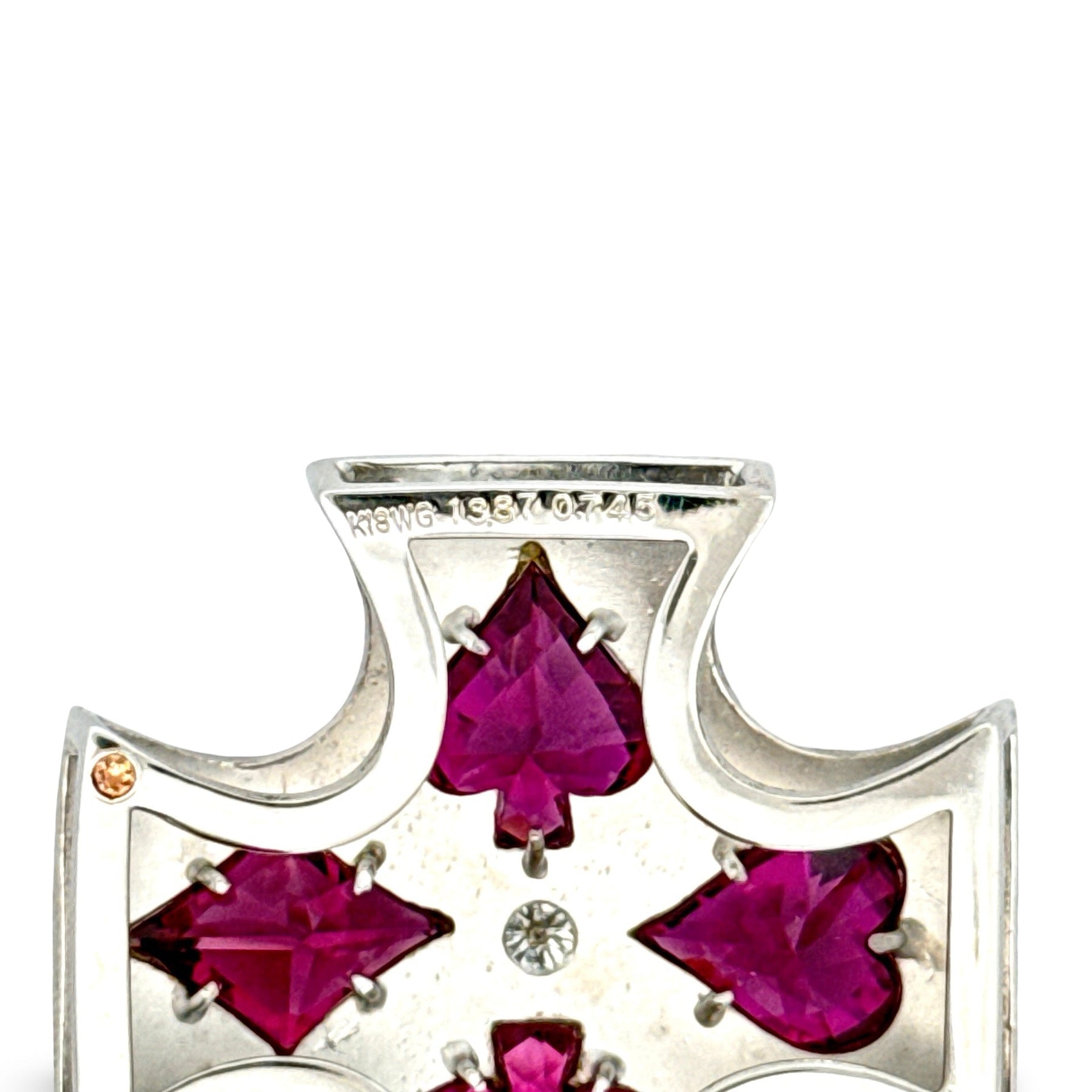 Jewelry Type : Pendant Metal Type : 18K White Gold Total Weight : 18.70 grams Brand : Estate Period : 2000's Modern Measurement : 38.16x37.96mm Center Stone : Stone Type : Garnet Center Stone : Shape : Fancy Cut Center Stone : Stone Weight : 13.87 ct Center Stone : Quantity : 4 Side Stone 1 : Stone Type : Diamond Side Stone 1 : Shape : Round Brilliant Cut Side Stone 1 : Stone Weight : 0.74 ct Side Stone 1 : Quantity : 36 Side Stone 1 : Color : H-I Side Stone 1 : Clarity : VS2-SI1