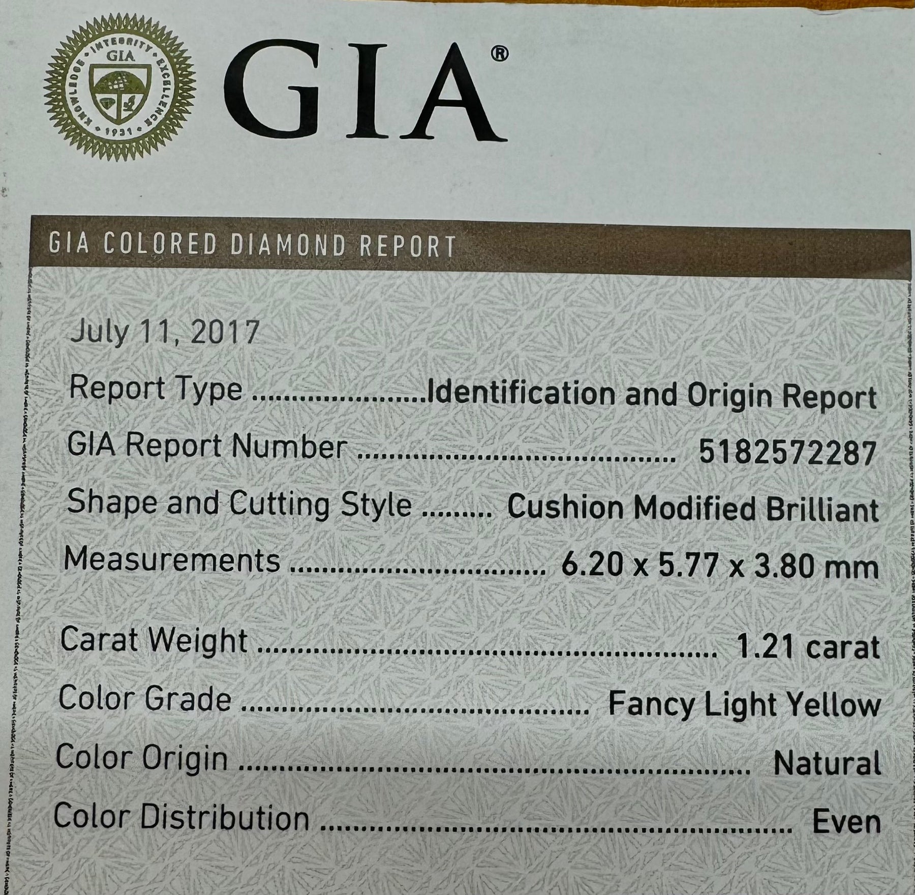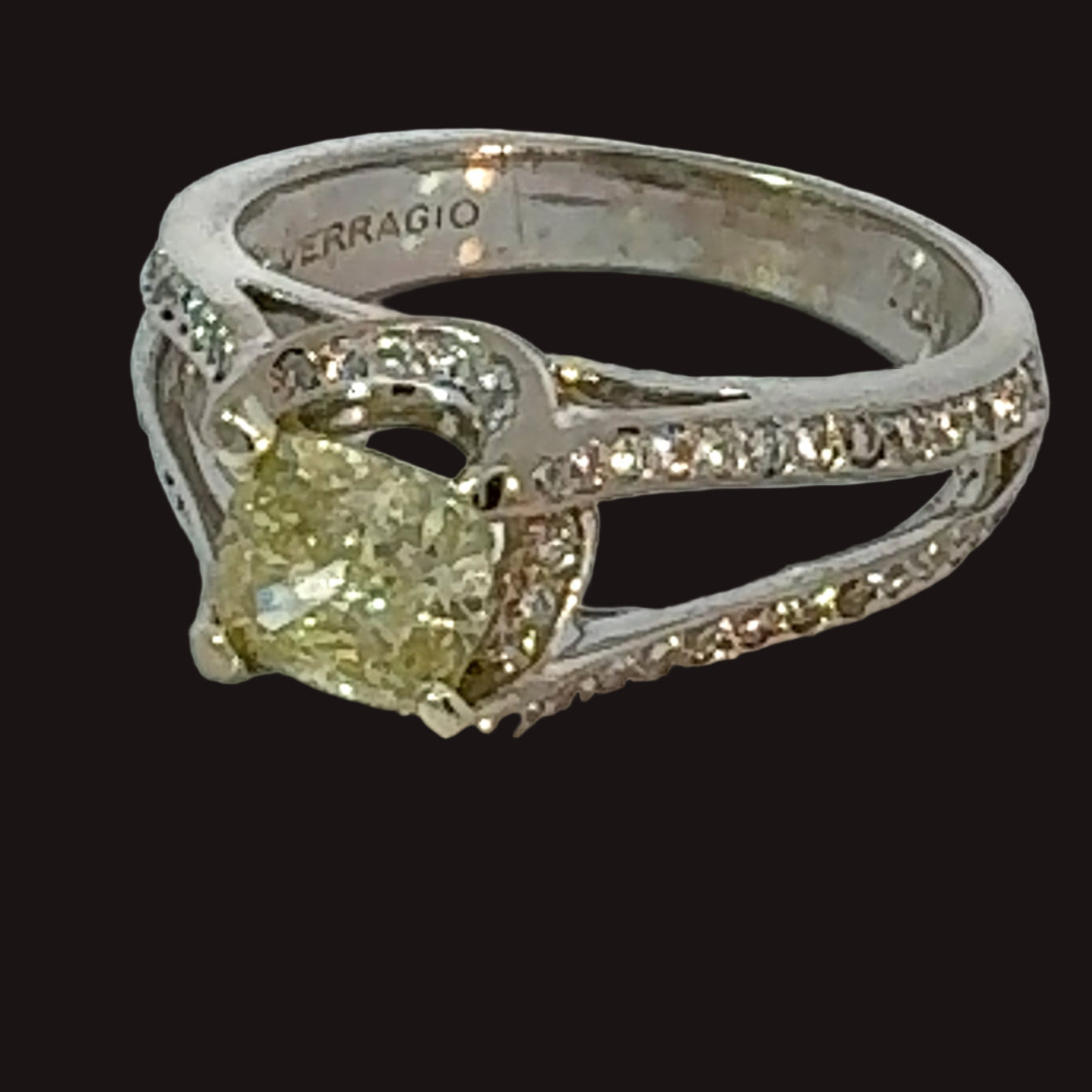 Estate - Verragio Ring, 1 Cushion Modified Diamond 1.21ct GIA #5182572287 Fancy Light Yellow I1 (clarity not on cert), Round Diamond 0.33 cttw G-H VS1-VS2, 18K White Gold 6.09g (Original Cert)