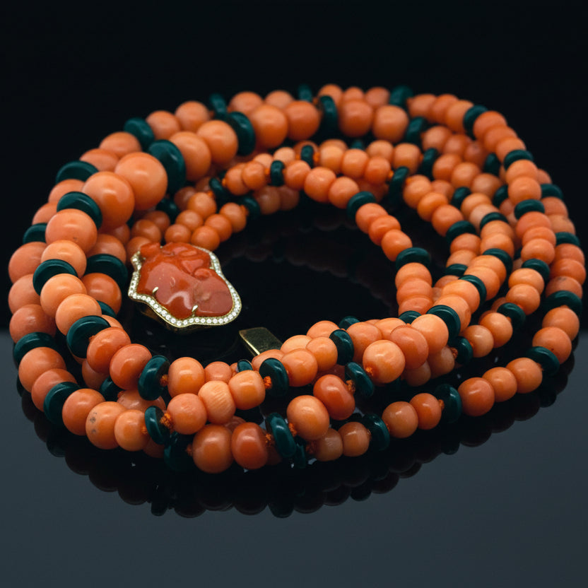 Jewelry Type : Necklace Metal Type : 18K Yellow Gold Metal Weight : 19.50 grams Brand : Italian Period : 1990's Measurement : 17" Side Stone 1 : Stone Type : Diamond Side Stone 1 : Shape : Round Brilliant Cut Side Stone 1 : Stone Weight : 0.29 ct Side Stone 1 : Color : H-I Side Stone 1 : Clarity : VS2-SI1 Side Stone 2 : Stone Type : Coral Side Stone 2 : Shape : Round Side Stone 3 : Stone Type : Onyx Side Stone 3 : Shape : Rondelles Cut Side Stone 4 : Stone Type : Coral Side Stone 4 : Shape : Freeform Side Stone 4 : Stone Weight : 8.85 ct