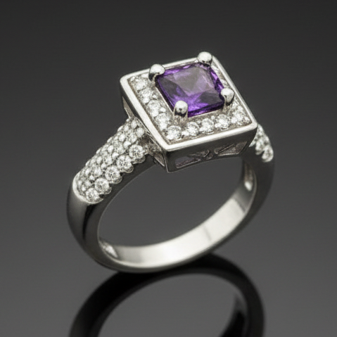 Jewelry Type : Ring Metal Type : 14K White Gold Metal Weight : 6.23 grams Ring Size : 6.25 Brand : Estate Center Stone : Stone Type : Amethyst Center Stone : Shape : Princess Cut Center Stone : Stone Weight : 0.69 ct Center Stone : Quantity : 1 Side Stone 1 : Stone Type : Diamond Side Stone 1 : Shape : Round Side Stone 1 : Stone Weight : 0.37 ct Side Stone 1 : Quantity : 48 Side Stone 1 : Color : G-H Side Stone 1 : Clarity : SI1-SI1