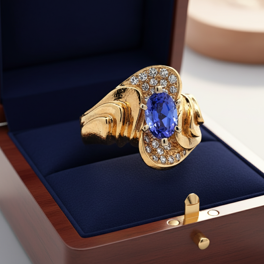 Estate Ring, 1 Tanzanite Oval 0.93 ct, 28 Round Diamond 0.32 cttw G VS2-SI1, 14K Yellow Gold 7.89g