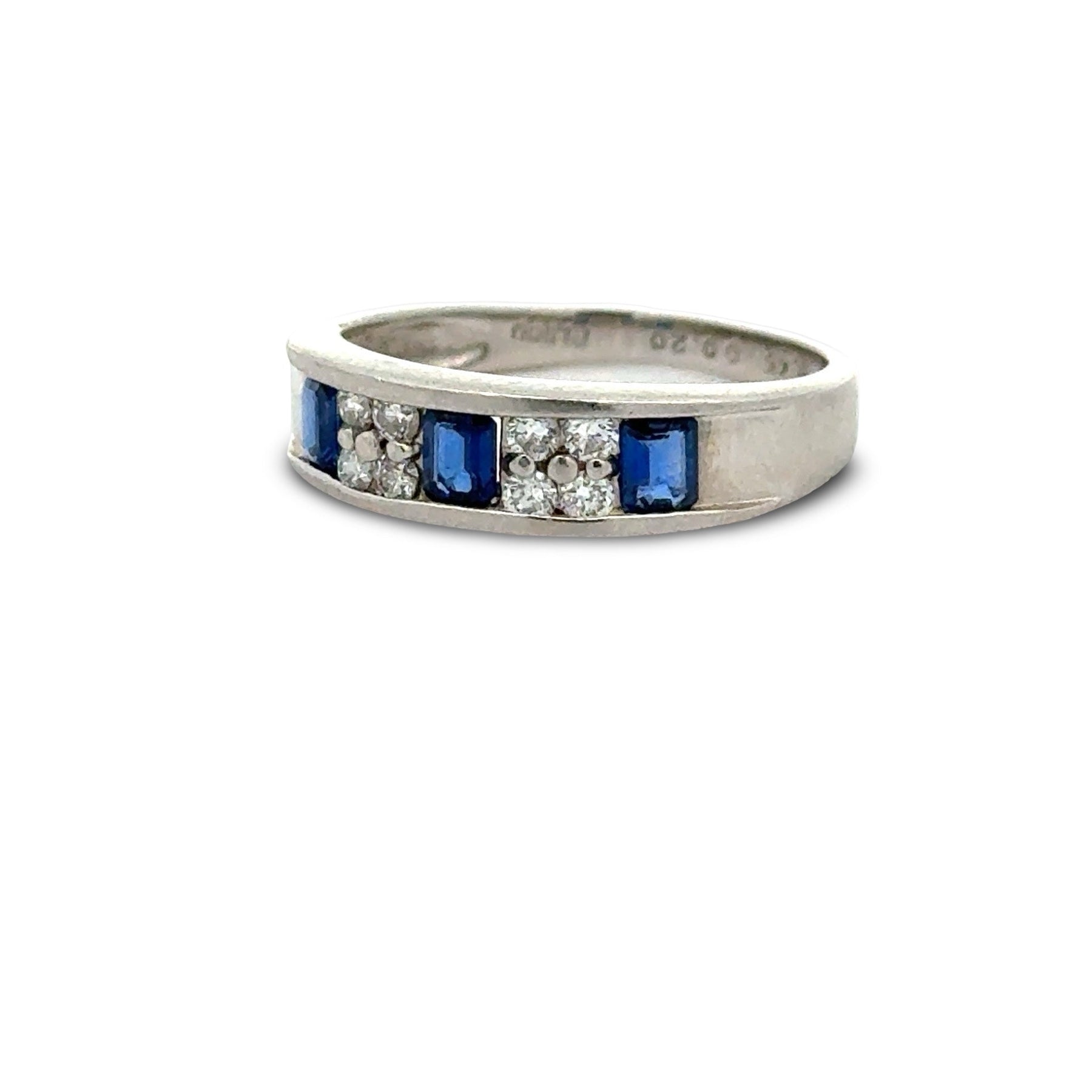 Jewelry Type : Ring Metal Type : Platinum Metal Weight : 3.93 grams Ring Size : 6.50 Brand : Estate Side Stone 1 : Stone Type : Diamond Side Stone 1 : Shape : Round Brilliant Cut Side Stone 1 : Stone Weight : 0.2 ct Side Stone 1 : Quantity : 8 Side Stone 1 : Color : G-H Side Stone 1 : Clarity : SI1-SI2 Side Stone 2 : Stone Type : Sapphire Side Stone 2 : Shape : Emerald Cut Side Stone 2 : Stone Weight : 0.45 ct Side Stone 2 : Quantity : 3