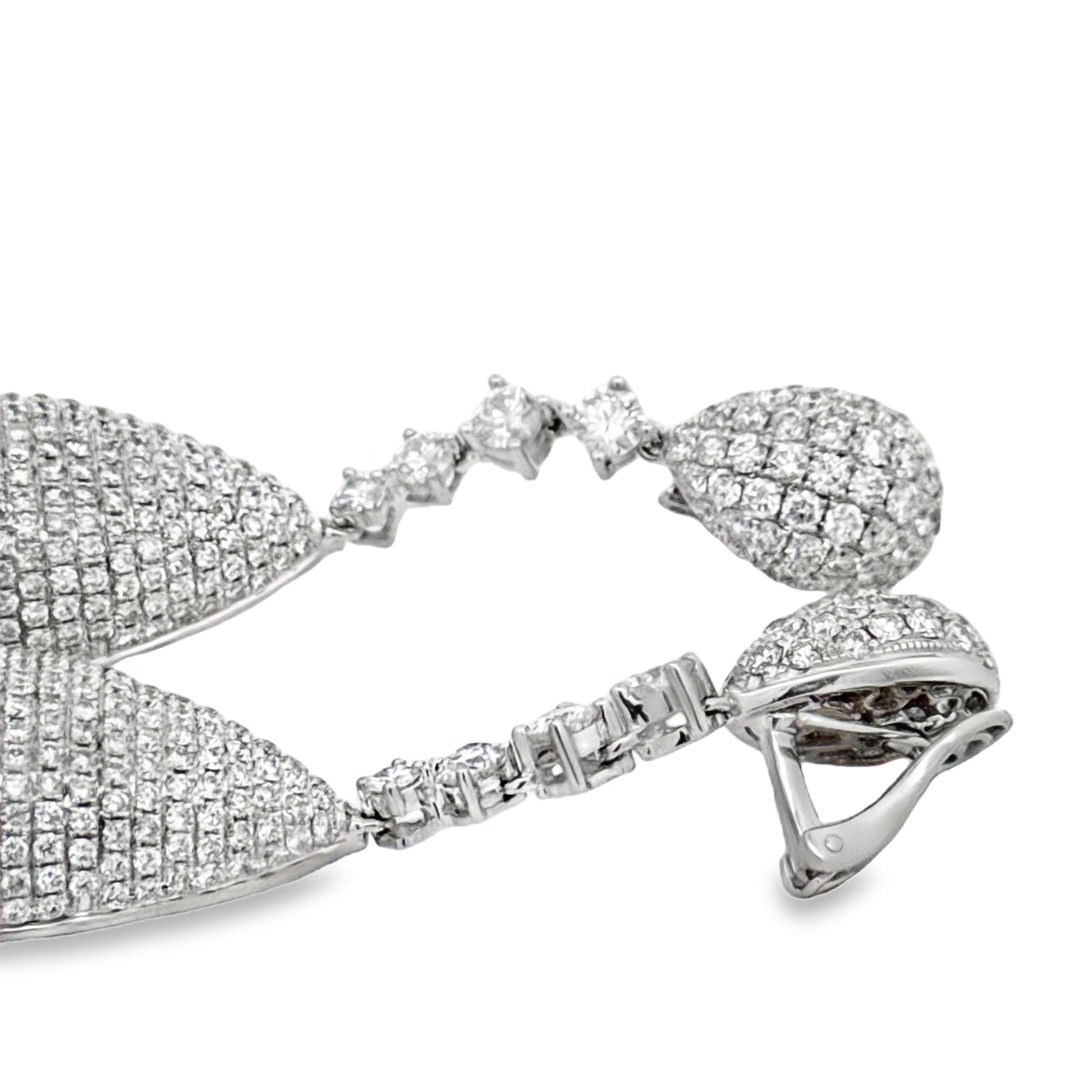 Jewelry Type : Earrings Metal Type : 18K White Gold Total Weight : 28.00 grams Brand : Private Manufacturer Period : 2000's Measurement : 2" Long Center Stone : Stone Type : Diamond Center Stone : Shape : Round Brilliant Cut Center Stone : Stone Weight : 12.68 ct Center Stone : Quantity : 690 Center Stone : Color : G-H Center Stone : Clarity : SI1