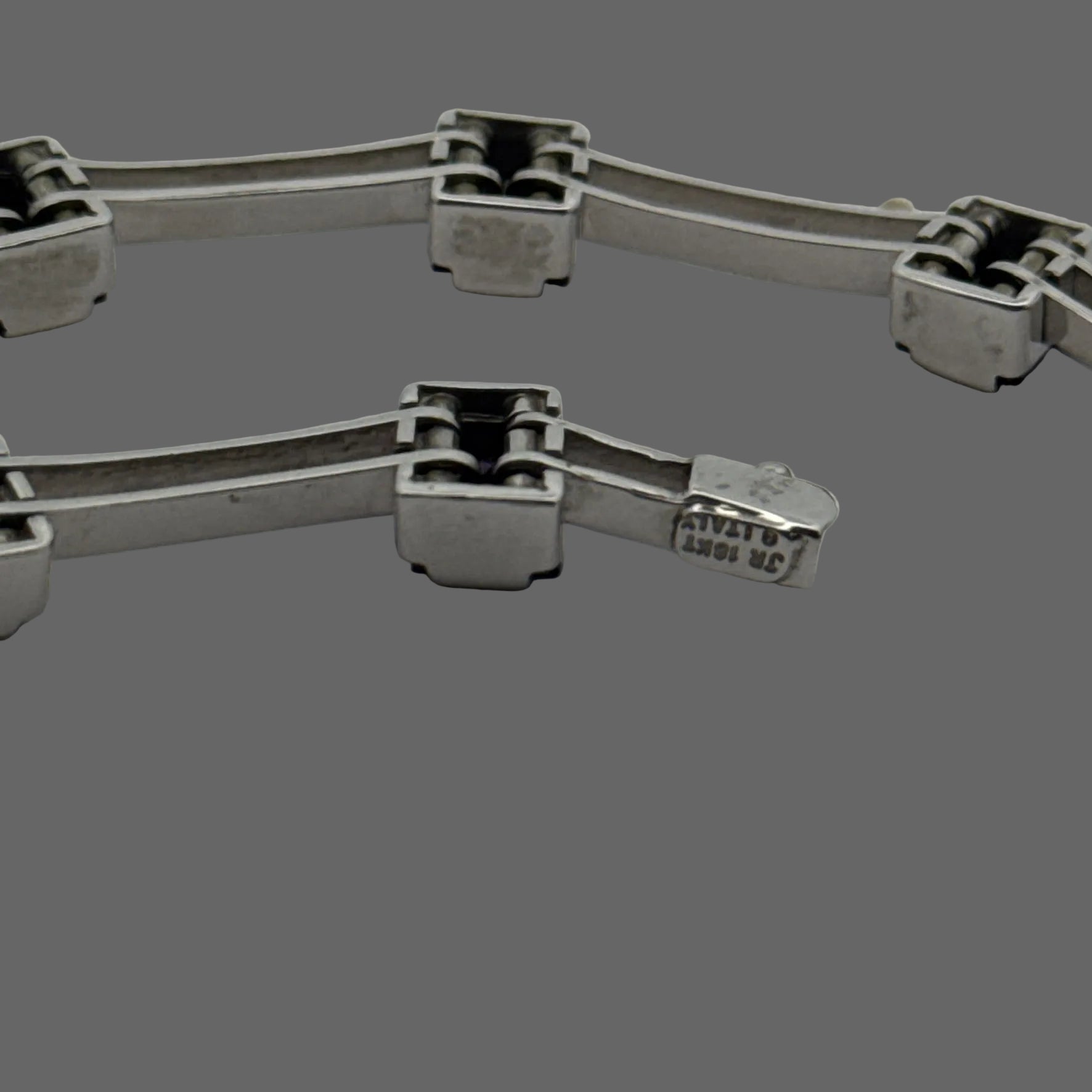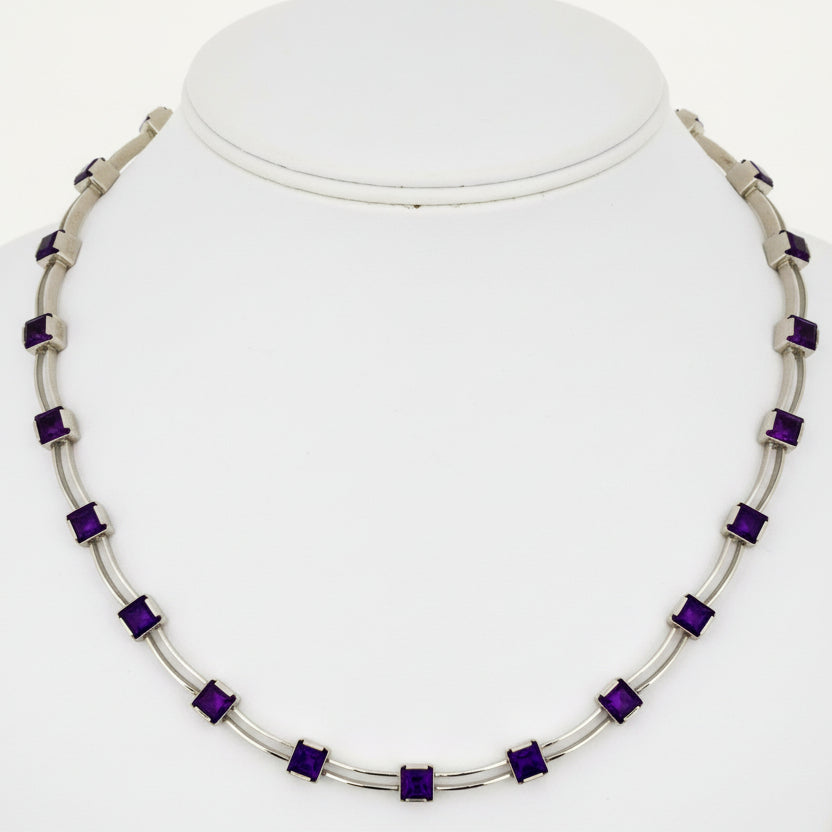 This stunning estate necklace features 20 carats of princess-cut amethyst stones set in 18K yellow gold, weighing 50.40 grams total. Crafted in the 2000s, this 16-inch designer piece showcases the rich purple hues and geometric precision of fine amethyst work. Perfect for adding sophisticated color and vintage elegance to any collection. We accept offers on all of our estate pieces.