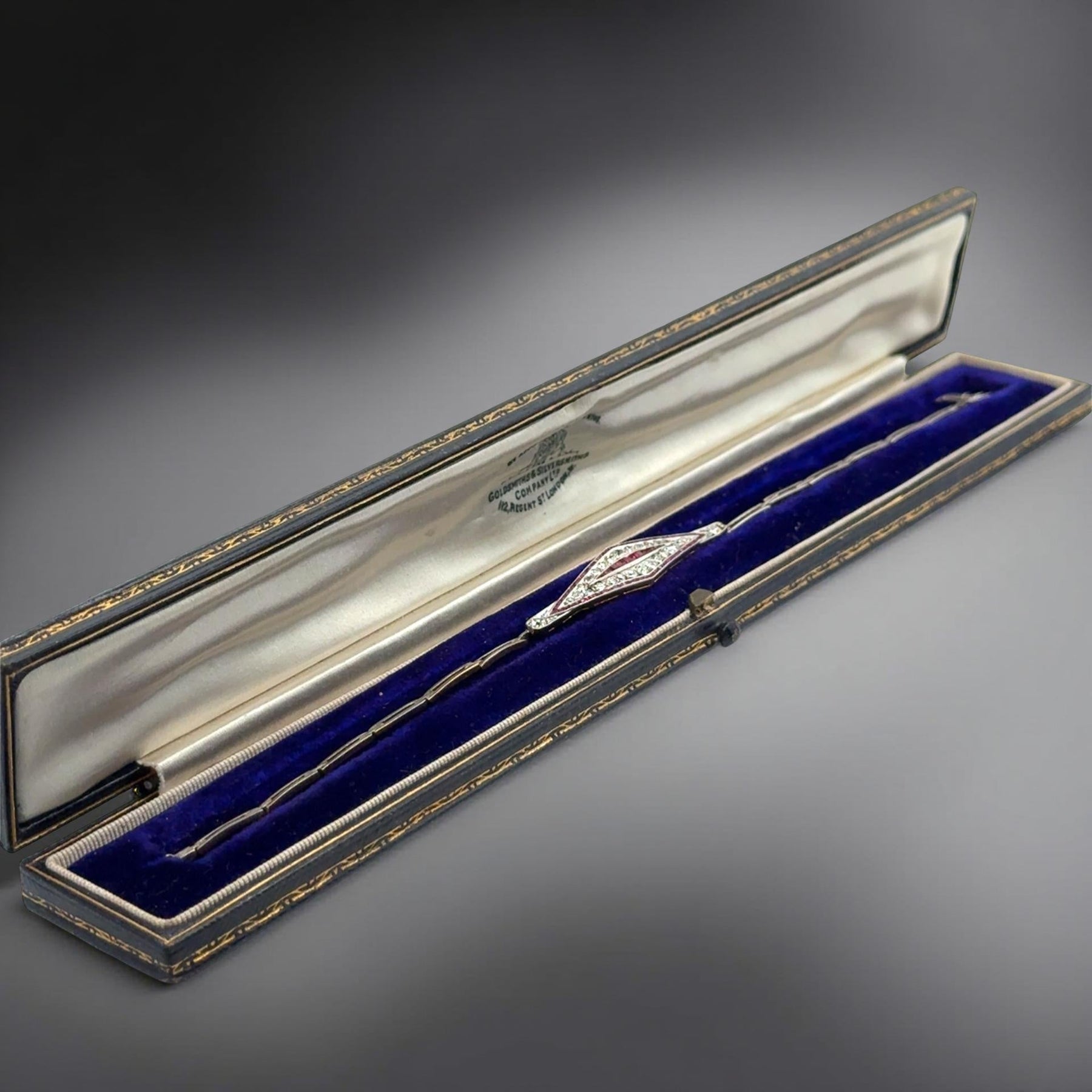 Jewelry Type : Bracelet Metal Type : 18K/PLAT Yellow Gold Metal Weight : 6.60 grams Brand : Art Deco Period : 1920's Measurement : 7.5" Side Stone 1 : Stone Type : Diamond Side Stone 1 : Shape : Old European Cut Side Stone 1 : Stone Weight : 0.9 ct Side Stone 1 : Color : G-H Side Stone 1 : Clarity : VS1-SI1 Side Stone 2 : Stone Type : Ruby Side Stone 2 : Shape : French Cut Side Stone 2 : Stone Weight : 0.75 ct