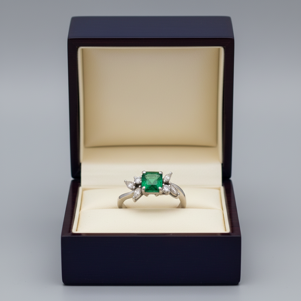 Jewelry Type : Ring Metal Type : Platinum Metal Weight : 5.48 grams Ring Size : 6.75 Brand : Sena Center Stone : Stone Type : Emerald Center Stone : Shape : Princess Cut Center Stone : Stone Weight : 1.2 ct Center Stone : Quantity : 1 Side Stone 1 : Stone Type : Diamond Side Stone 1 : Shape : Mixed Cut Side Stone 1 : Stone Weight : 0.5 ct Side Stone 1 : Quantity : 6 Side Stone 1 : Color : J-L Side Stone 1 : Clarity : VS1-SI2